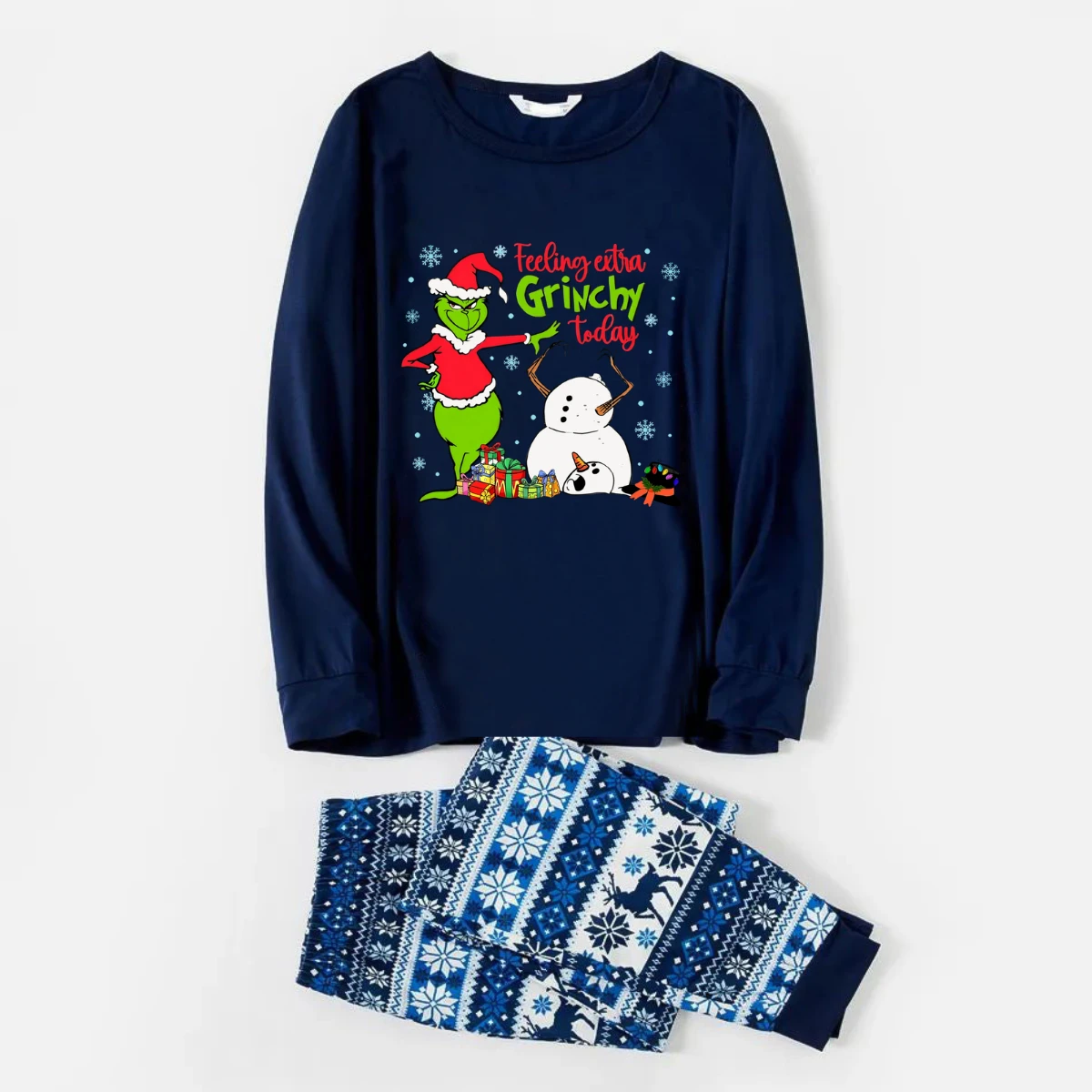 Joyful Blue Christmas Pajamas Set With Grinch and Snowman Print
