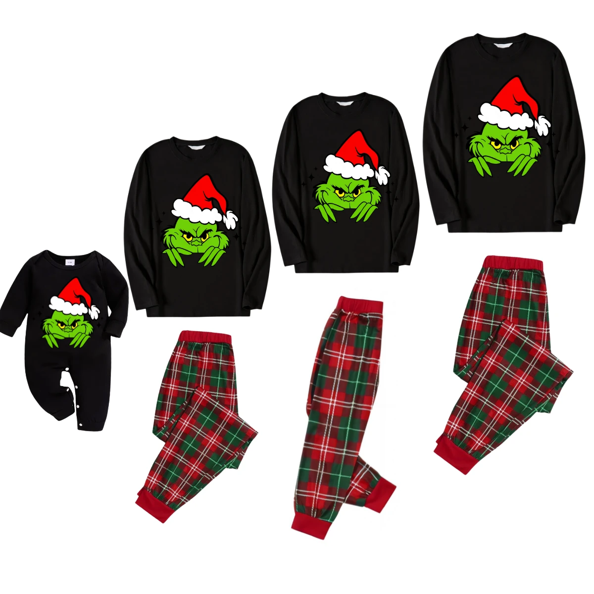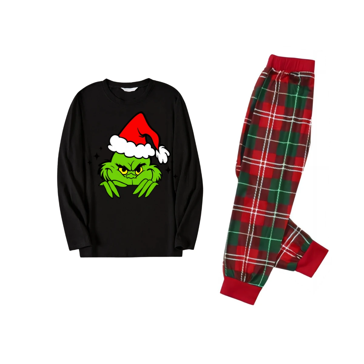 Green Cartoon Character with Red Hat Pattern Black Top Red and Green Plaid Family Matching Pajamas