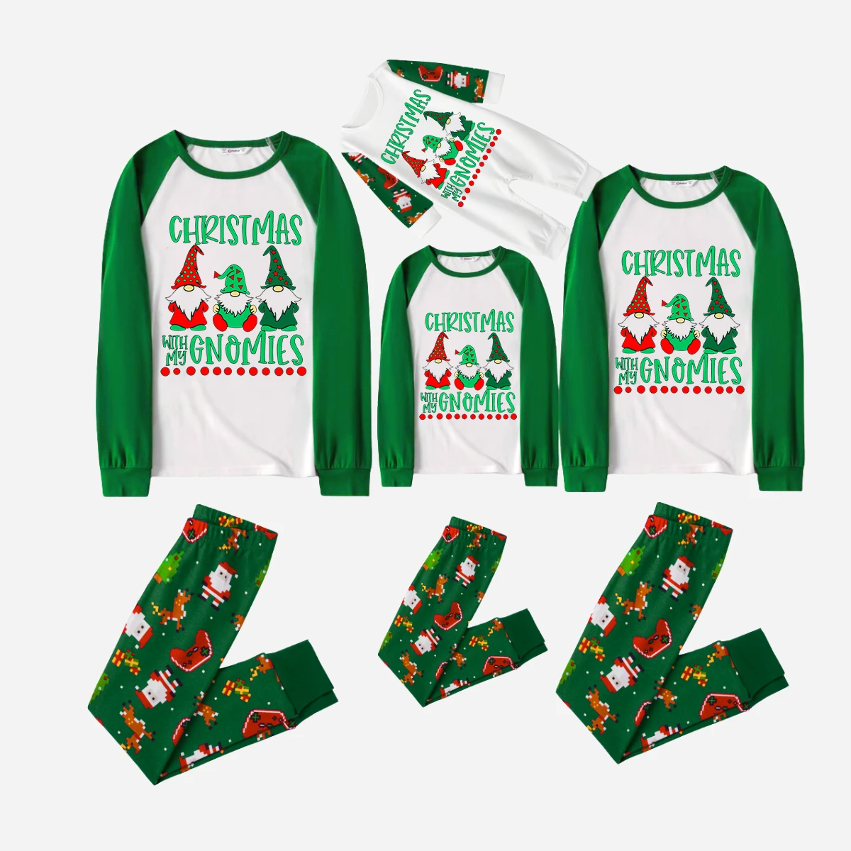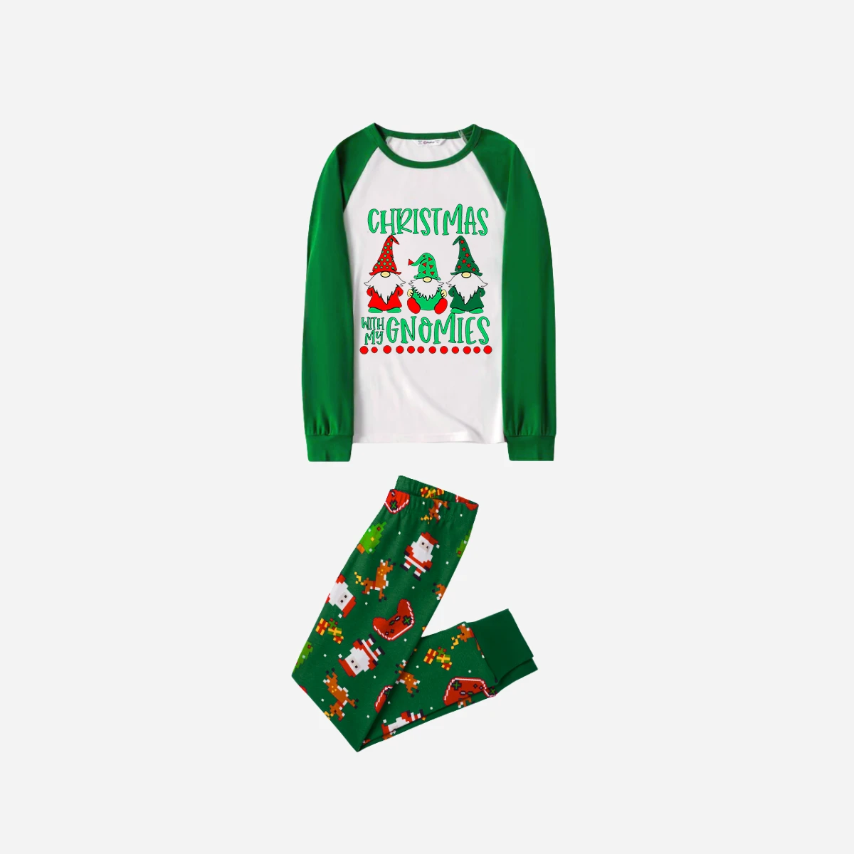 Joyful Green Raglan Top Christmas Pajamas Set With "Christmas With My Gnomies" Text Print