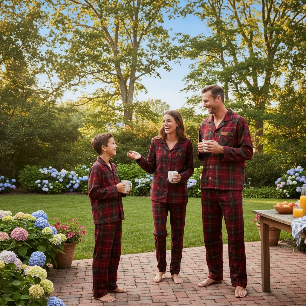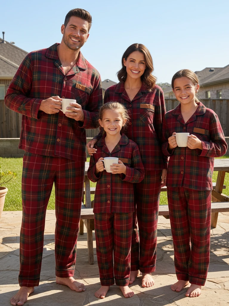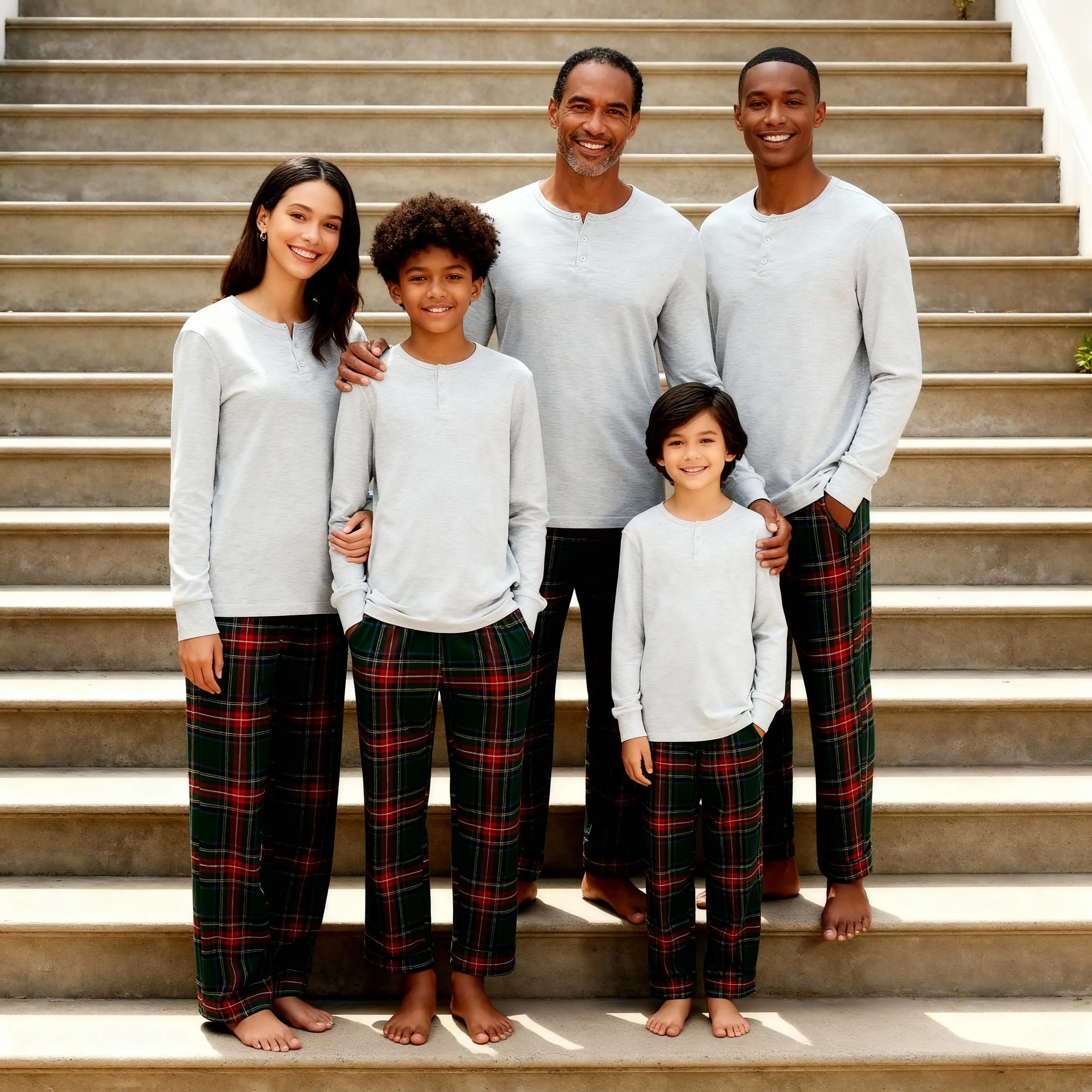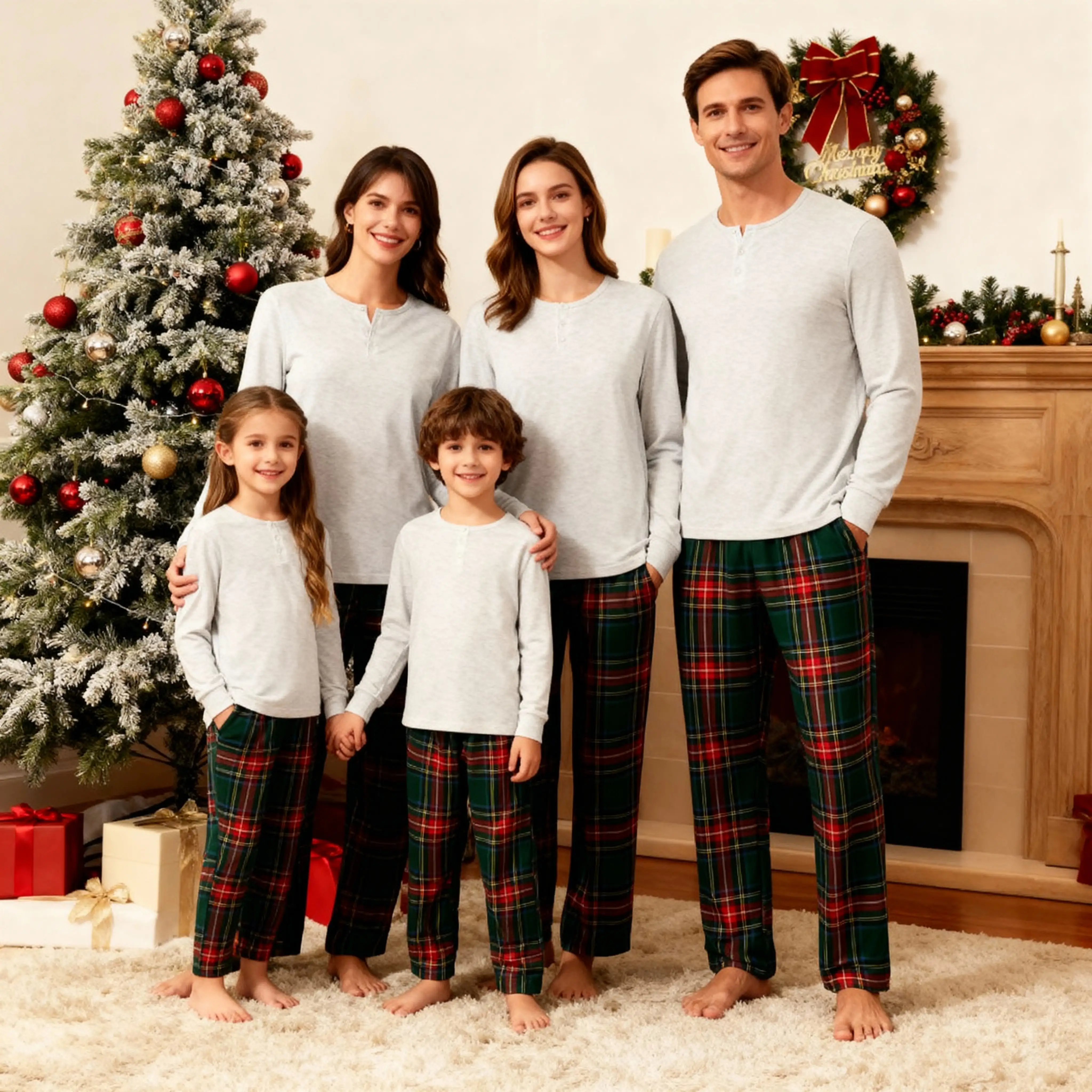 Holiday Pajamas Set for Whole Family – Gray Button-Neck Tee & Green Red Plaid Pants