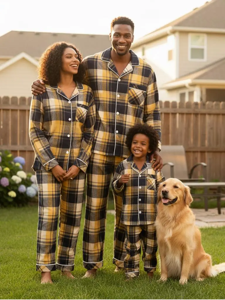 Matching Christmas Yellow and Blue Plaid Button Up Family Pajamas Sets