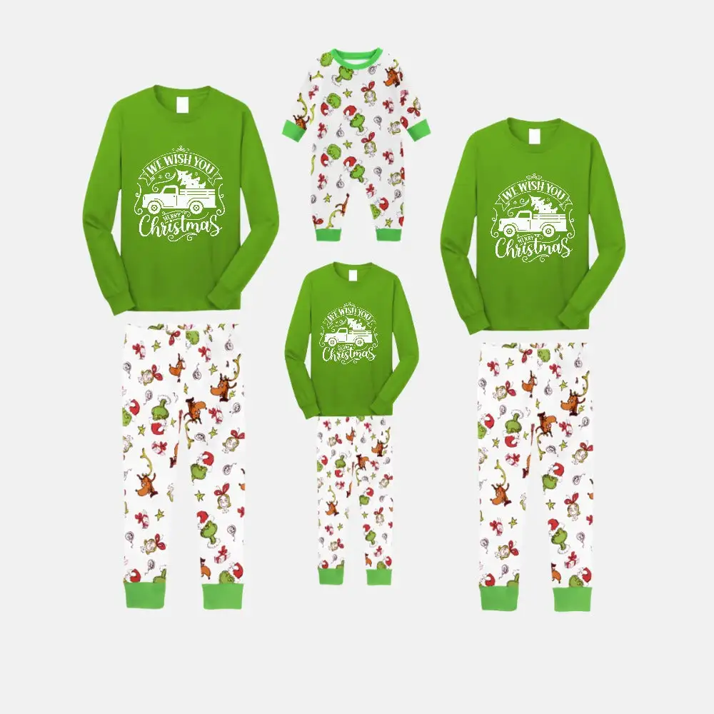 Christmas Family Matching Pajamas-Green Top and Grinch Pants Pjs Set with "We Wish You Merry Christmas" and Christmas Car Pattern Print