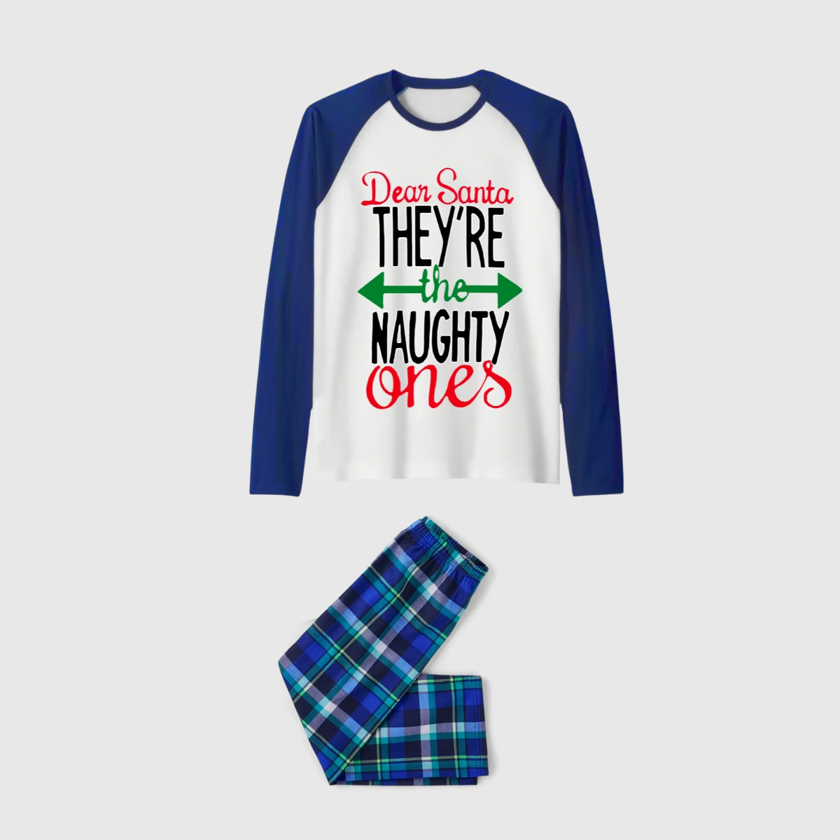 Dear Santa Naughty Ones Family Pajamas Set - White Top, Blue Plaid Pants, Plaid Sleeves