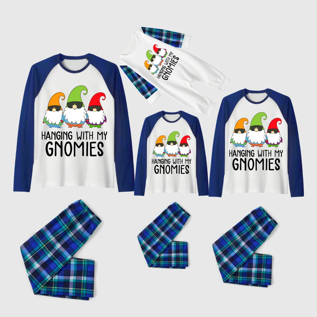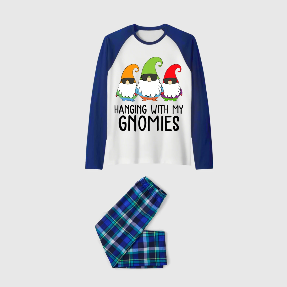 Hanging With My Gnomies Family Pajamas Set - White Top, Blue-Green Plaid Pants, Blue Solid Sleeves, Gnomes Print