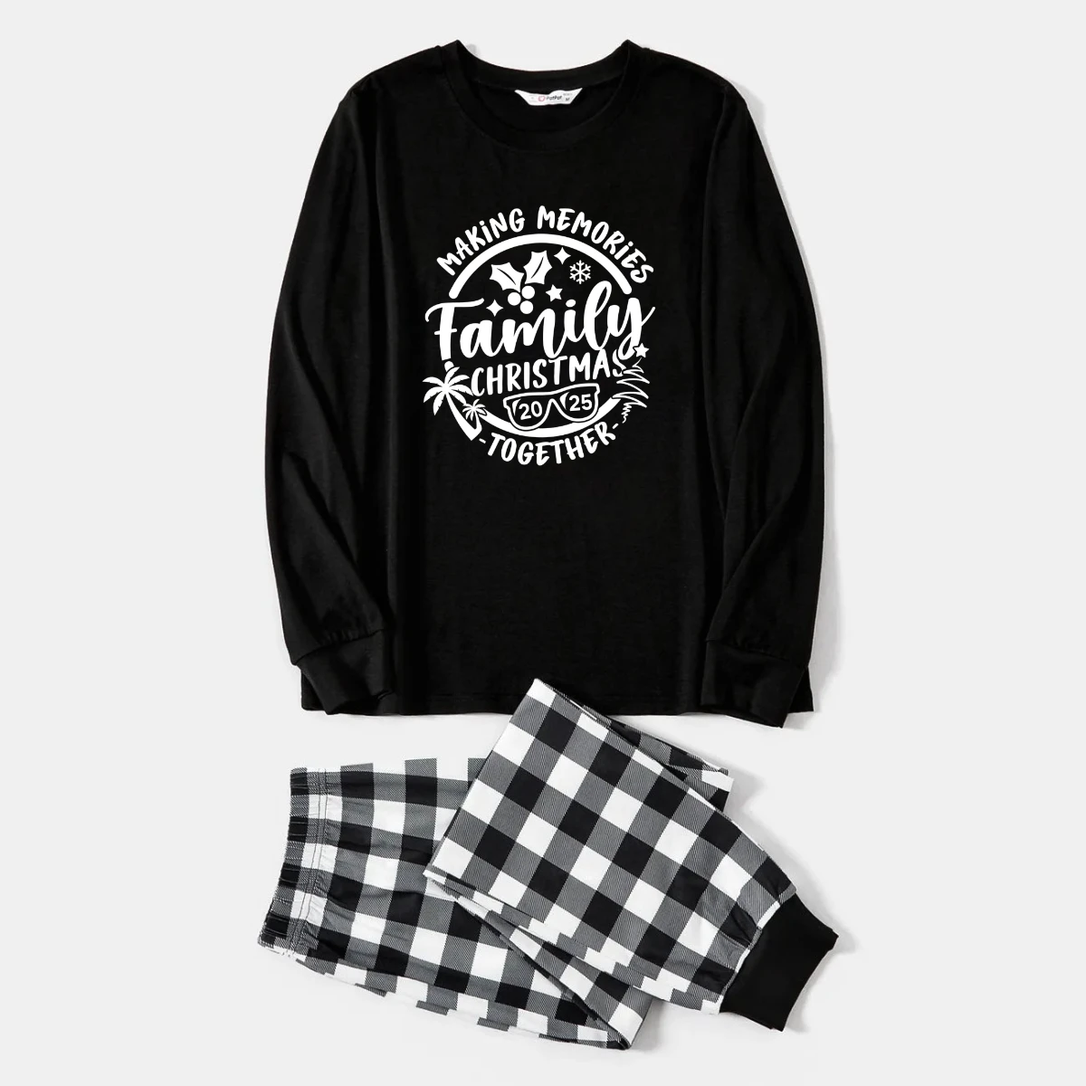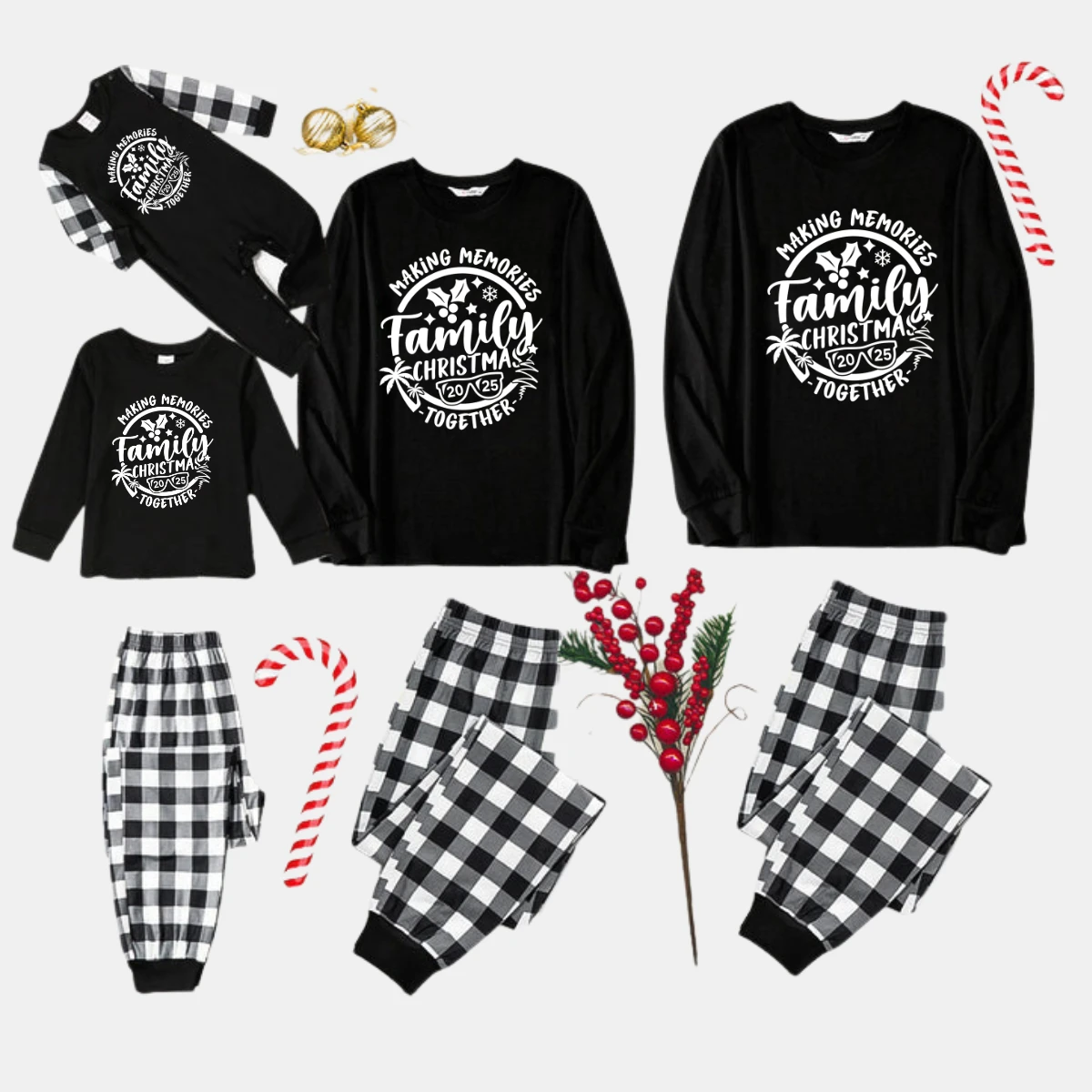 Christmas Make Memories Together 2025 Print Black Long Sleeve Top with Black And White Plaid Pants Family Matching Pajamas