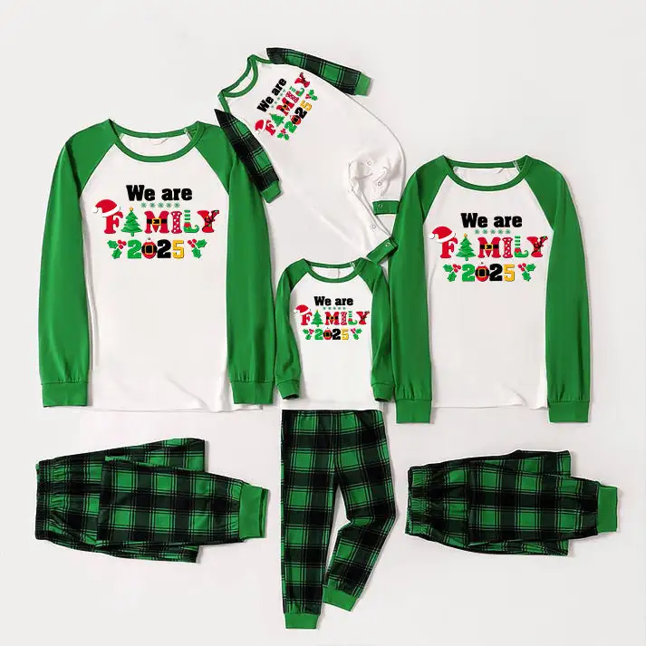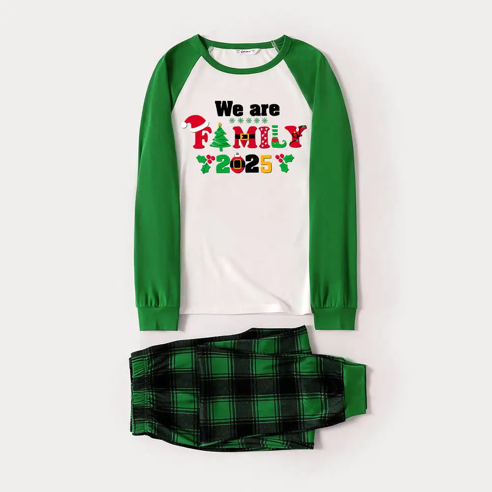 Christmas We are Family 2025 Letter Print Green Rotator Cuff Top With Green & Black Plaid Family Matching Pajamas