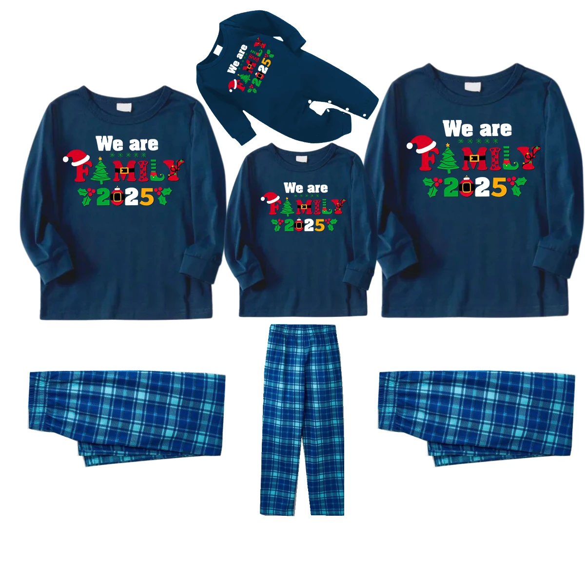 Christmas We are Family 2025 Letter Print Blue Long Sleeve Top With Blue Plaid Family Matching Pajamas