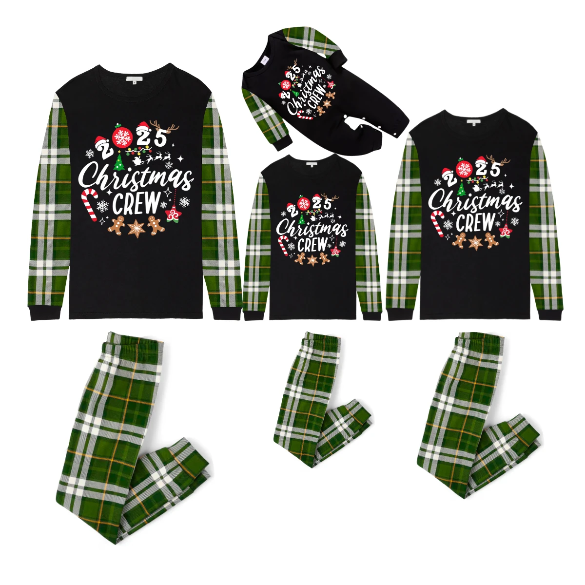 Christmas Crew 2025 Family Pajamas Set - Black Top, Green Pants, Green Plaid Sleeves, Gingerbread Candy Print