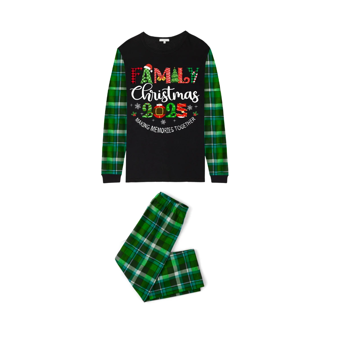 Family Christmas 2025 Making Memories Family Pajamas Set - Black Top, Green Pants, Green-Blue Plaid Sleeves