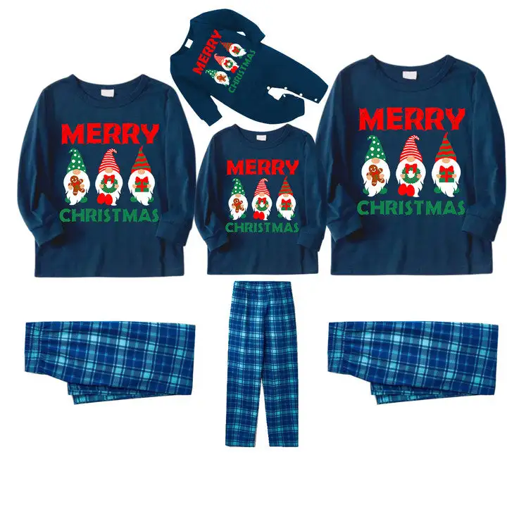 Christmas Elf Pattern Blue Long Sleeve Top With Blue Plaid Family Matching Pajamas