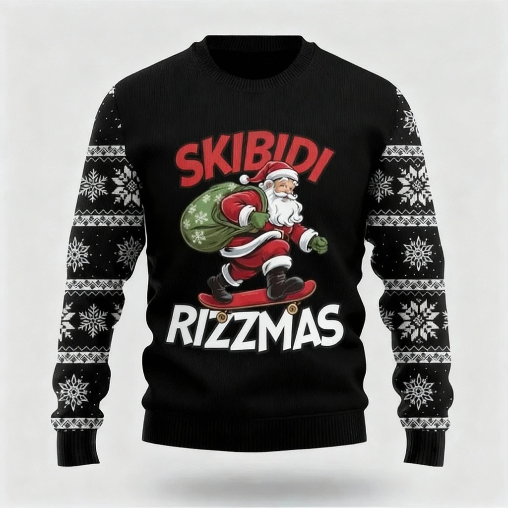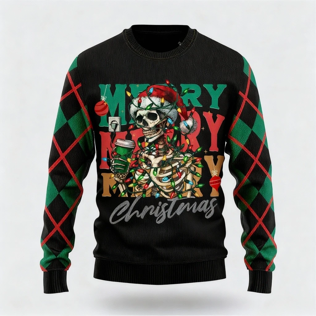 Funny Skull Print - Maximalist Christmas Print Ugly Sweater