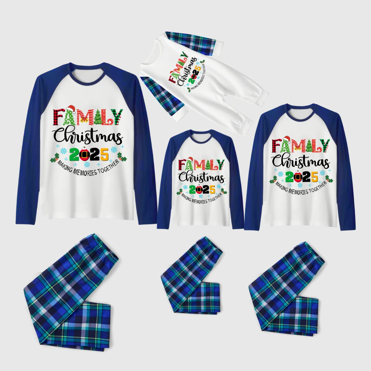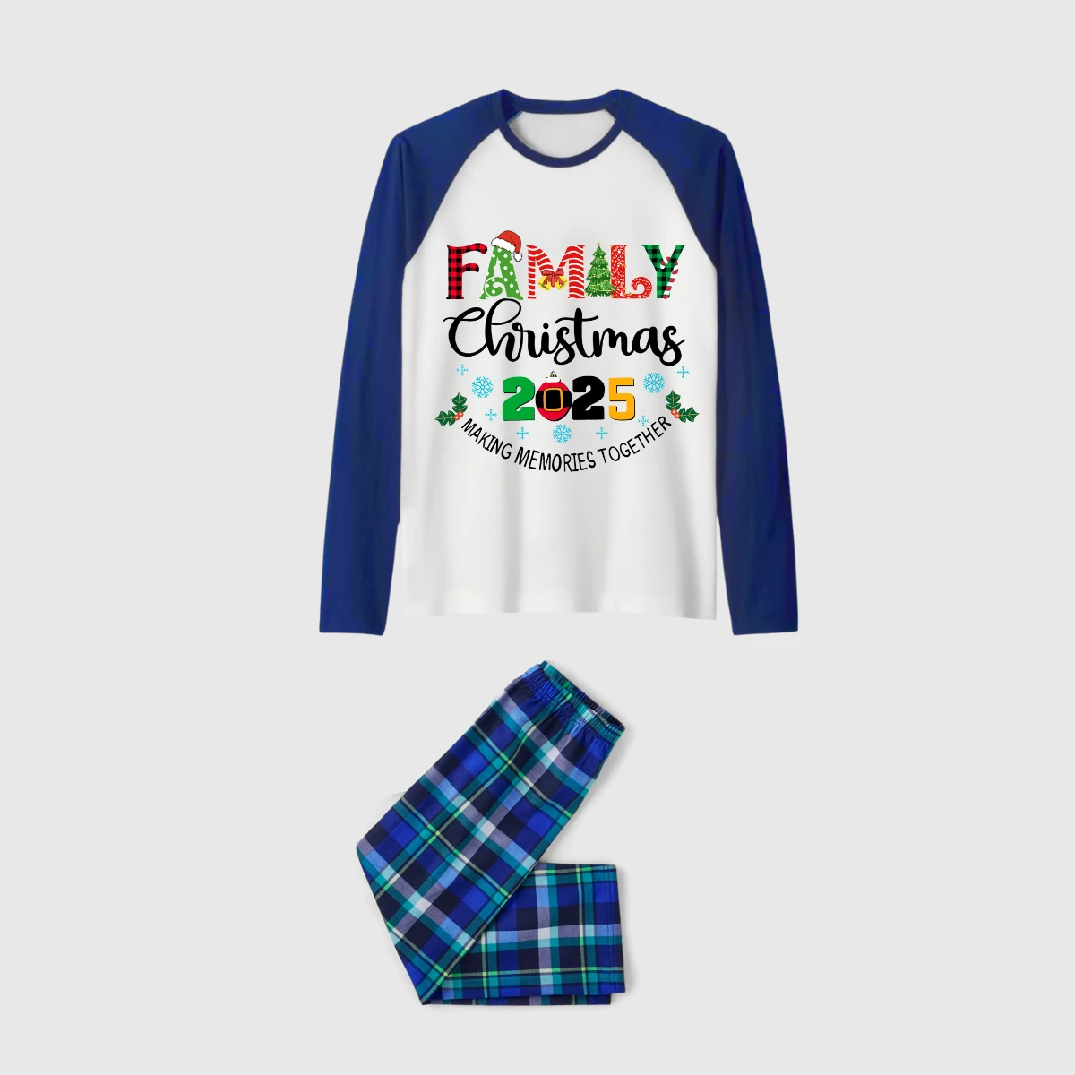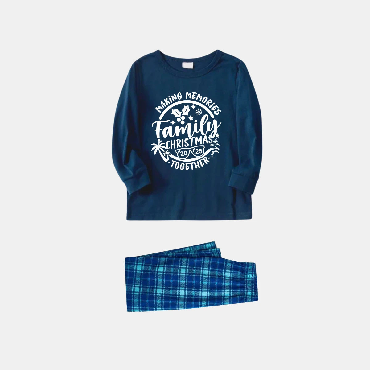 Christmas Make Memories Together 2025 Print Blue Long Sleeve Top With Blue Plaid Family Matching Pajamas