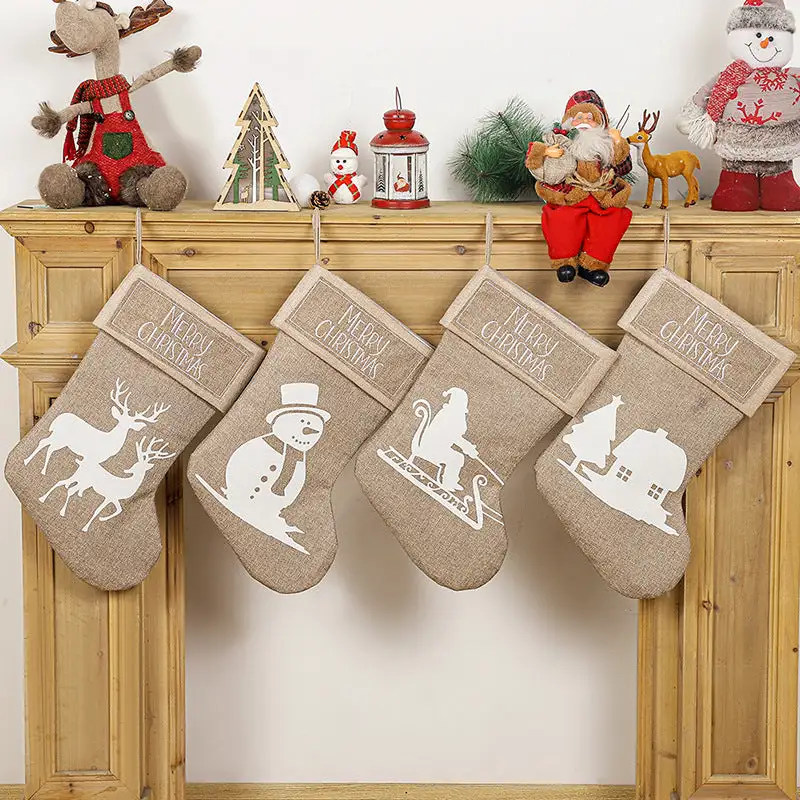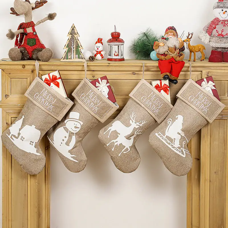 Merry Christmas Santa Snowman Elk House Printed Khaki Linen Christmas Socks Gift Bag Home Decoration