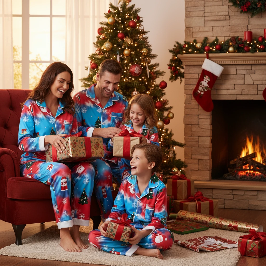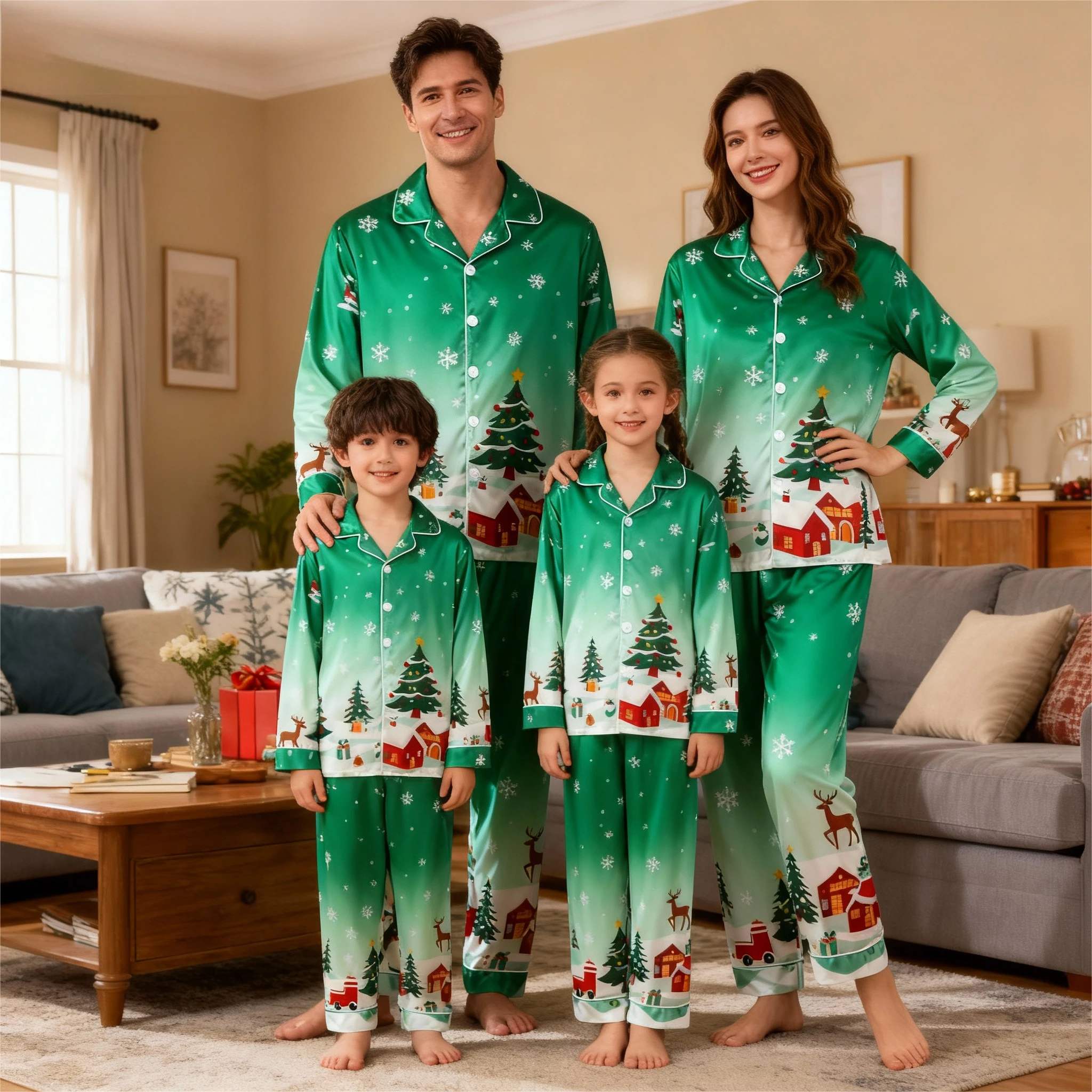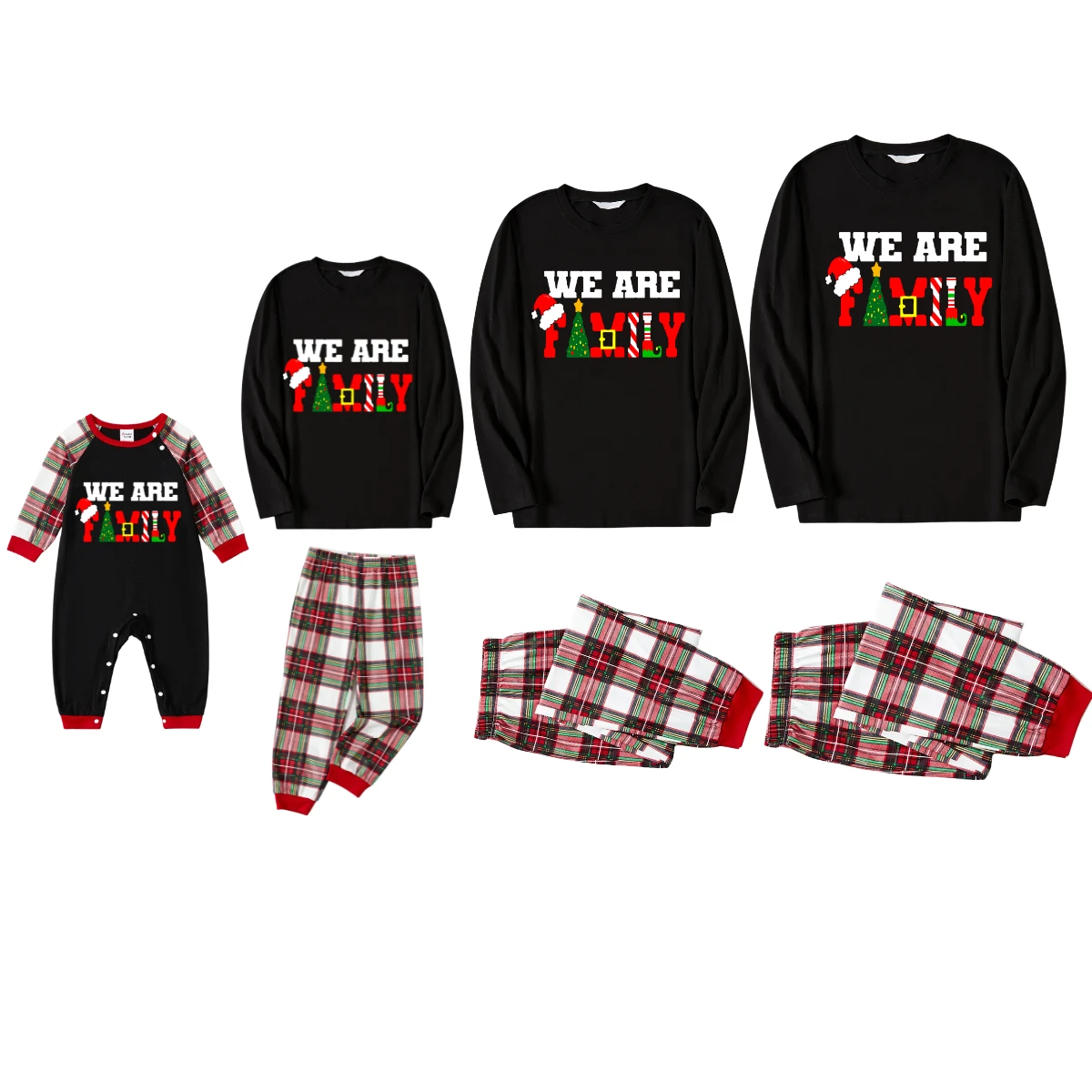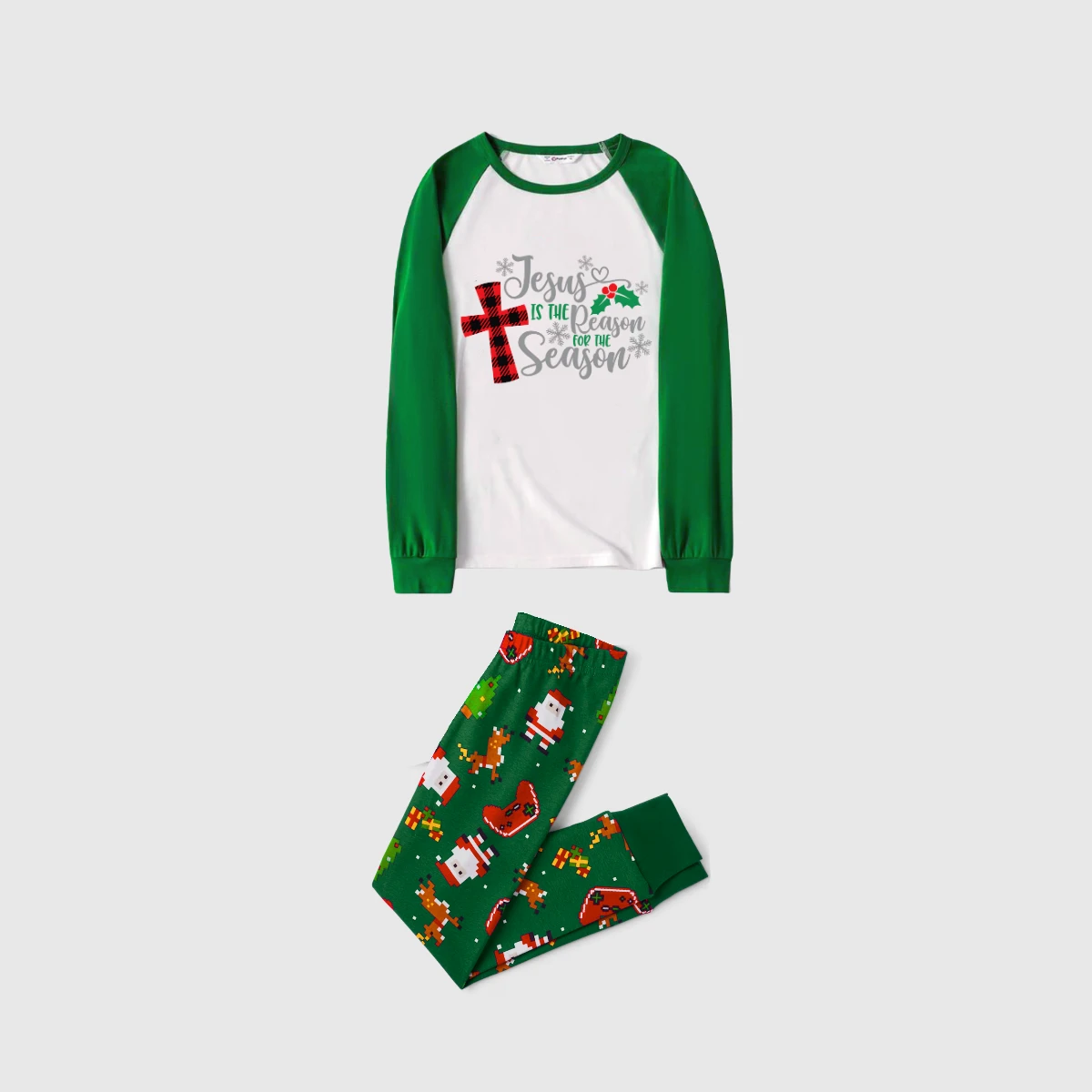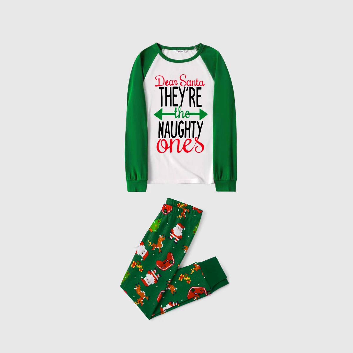 Dear Santa Naughty Ones Family Pajamas Set - White Top, Green Christmas Pattern Pants, Green Sleeves