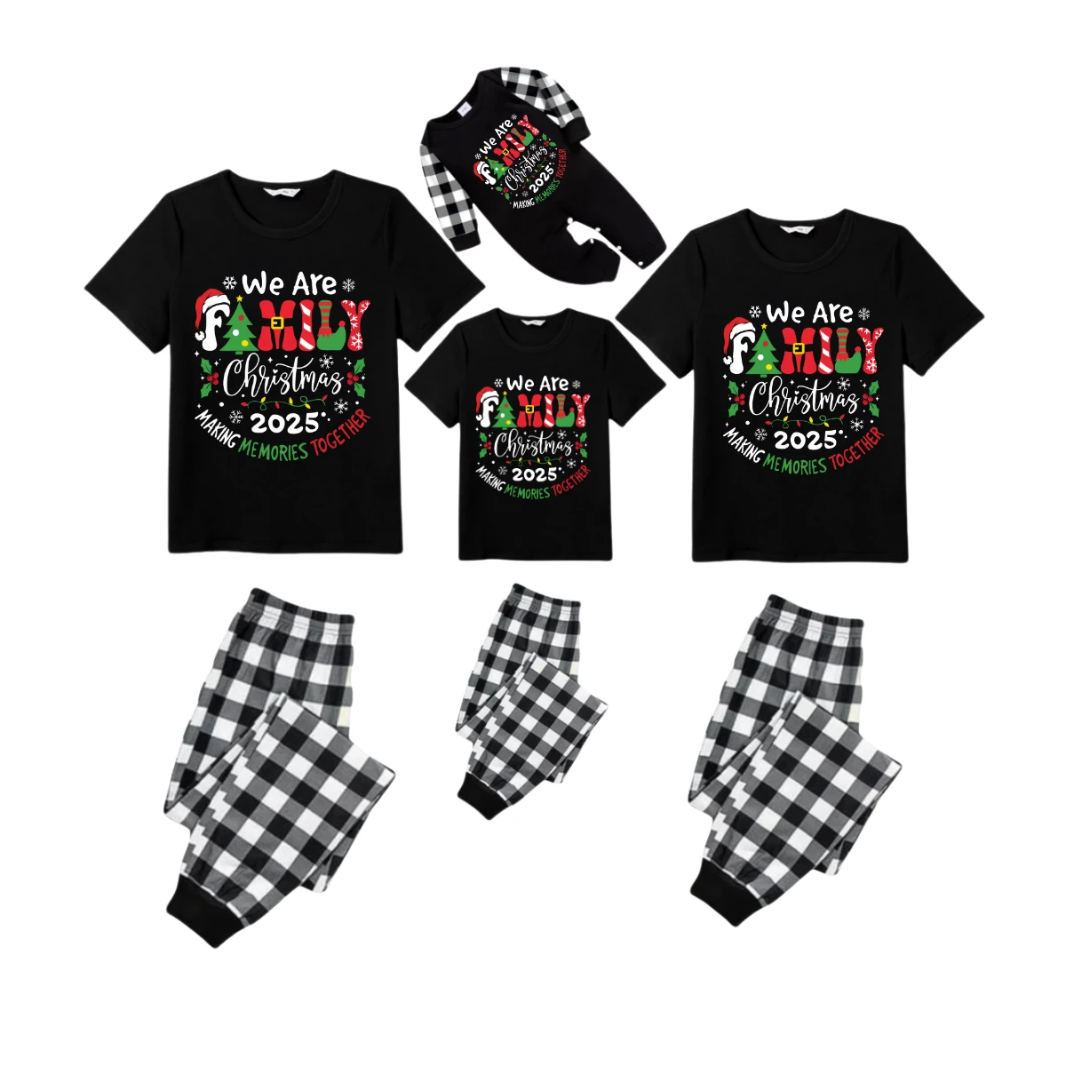 We Are Family Making Memories Together Christmas 2025 Pajamas Set - Black Top Black and White Plaid Pants Colorful Text Graphic