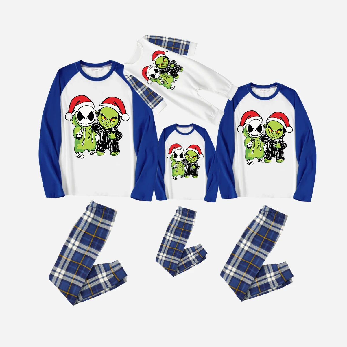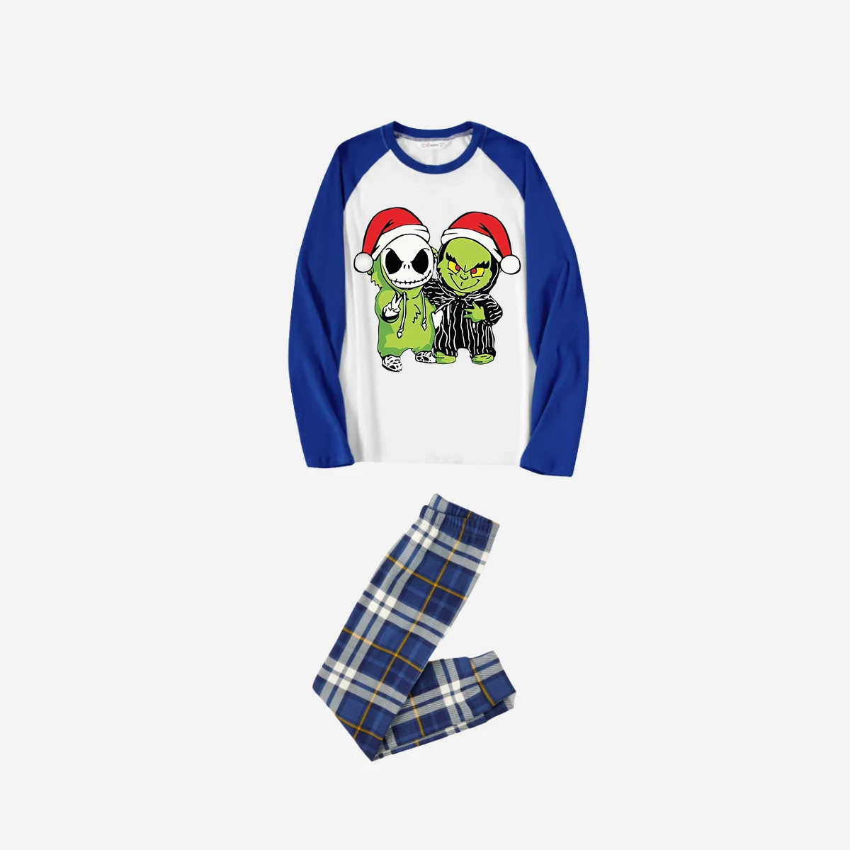 Blue Raglan Top Blue Plaid Christmas Pajamas Set With Grinch and Cartoon Pattern Print