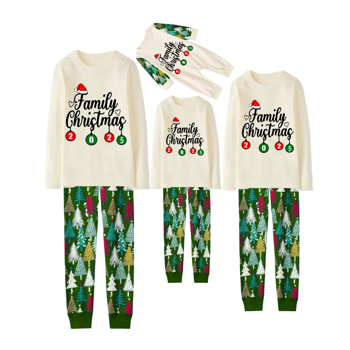 Christmas Tree Print Family Matching Family Pajamas Set - White Top, Green Pants, Tree Pattern
