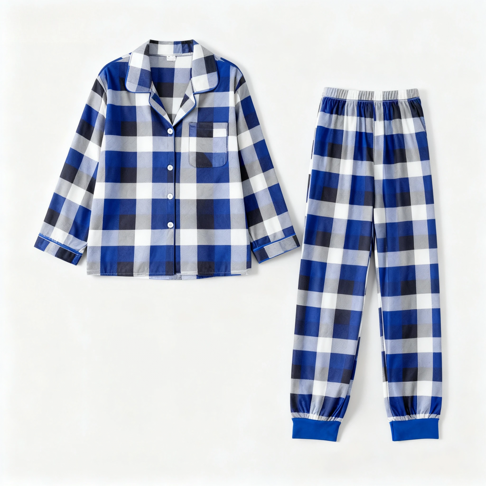 Family Christmas Blue and White Plaid Button-Front Pajamas Sets
