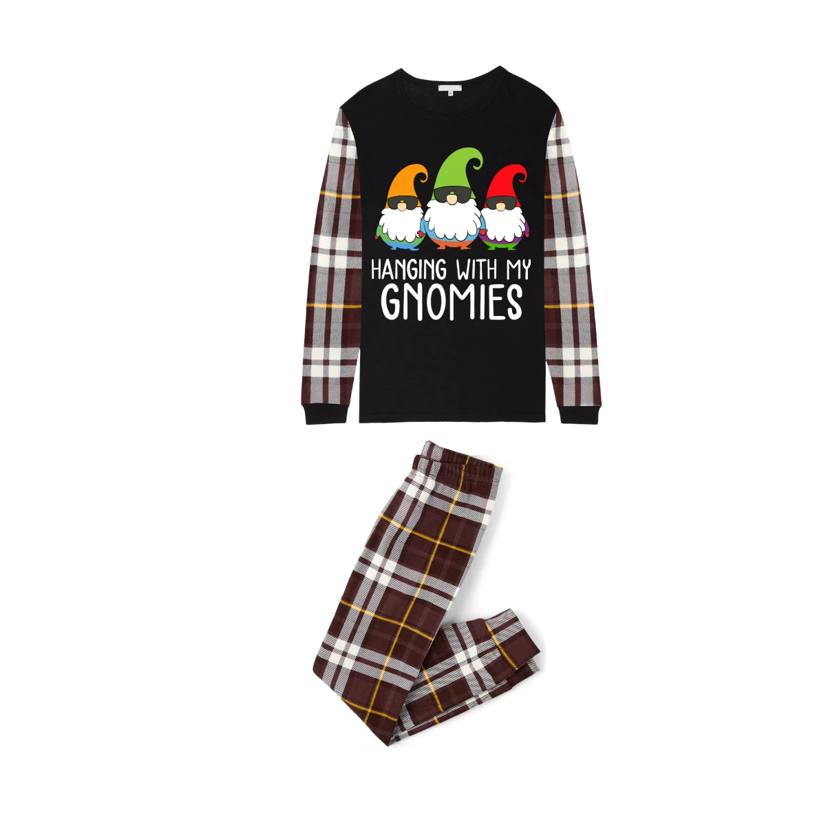 Hanging With My Gnomies Christmas 2025 Family Pajamas Set - Black Top, Brown Pants, Brown Plaid Sleeves