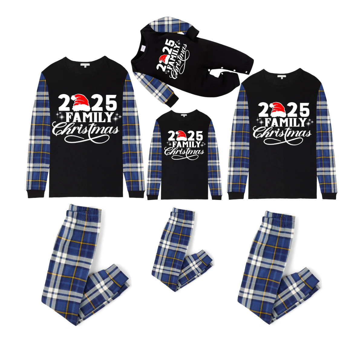 Christmas 2025 Family Matching Family Pajamas Set - Black Top, Blue Pants, Plaid Pattern
