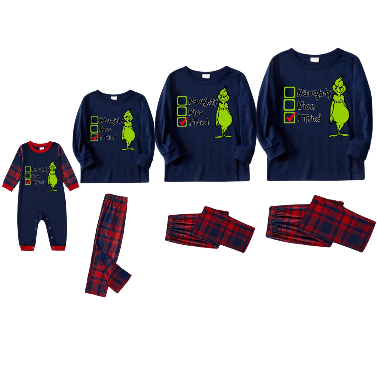 Christmas Matching Cartoon Pattern and Text Print Blue Long Sleeve Top with Red & Blue Plaid Family Matching Pajamas