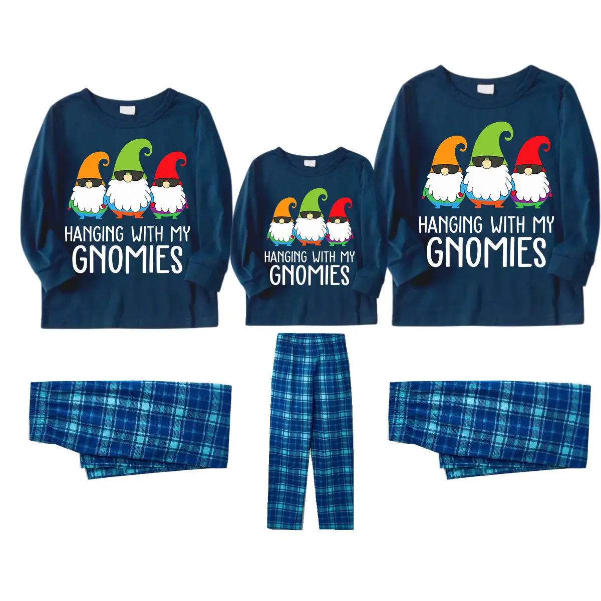 Three Santas "HANGING WITH MY GNOMIES" Monogram Print Blue Long Sleeves Top with Blue & Green Plaid Pants Family Matching Pajamas