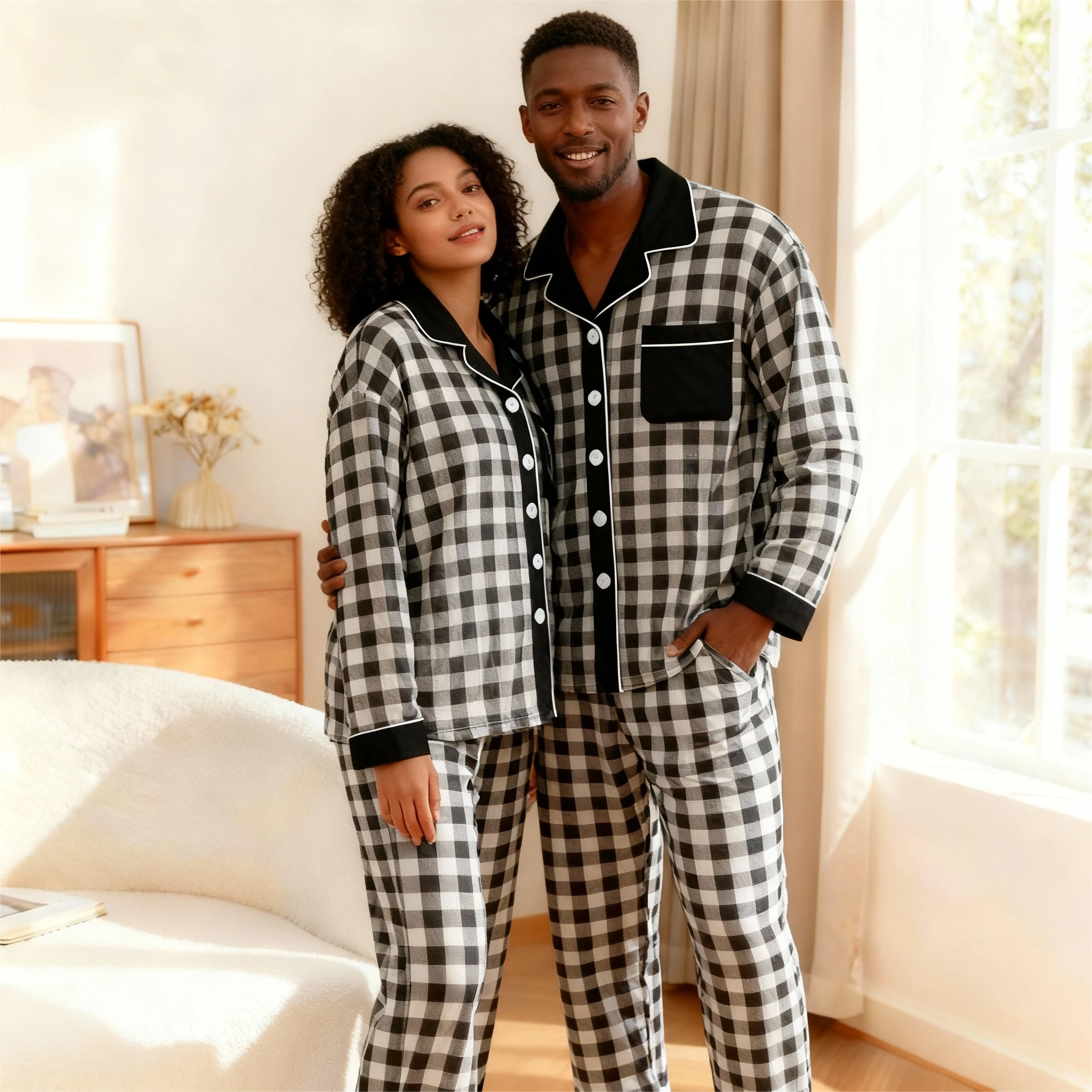 Festive Red and Green Plaid Button-Up Pajamas Set for Couple