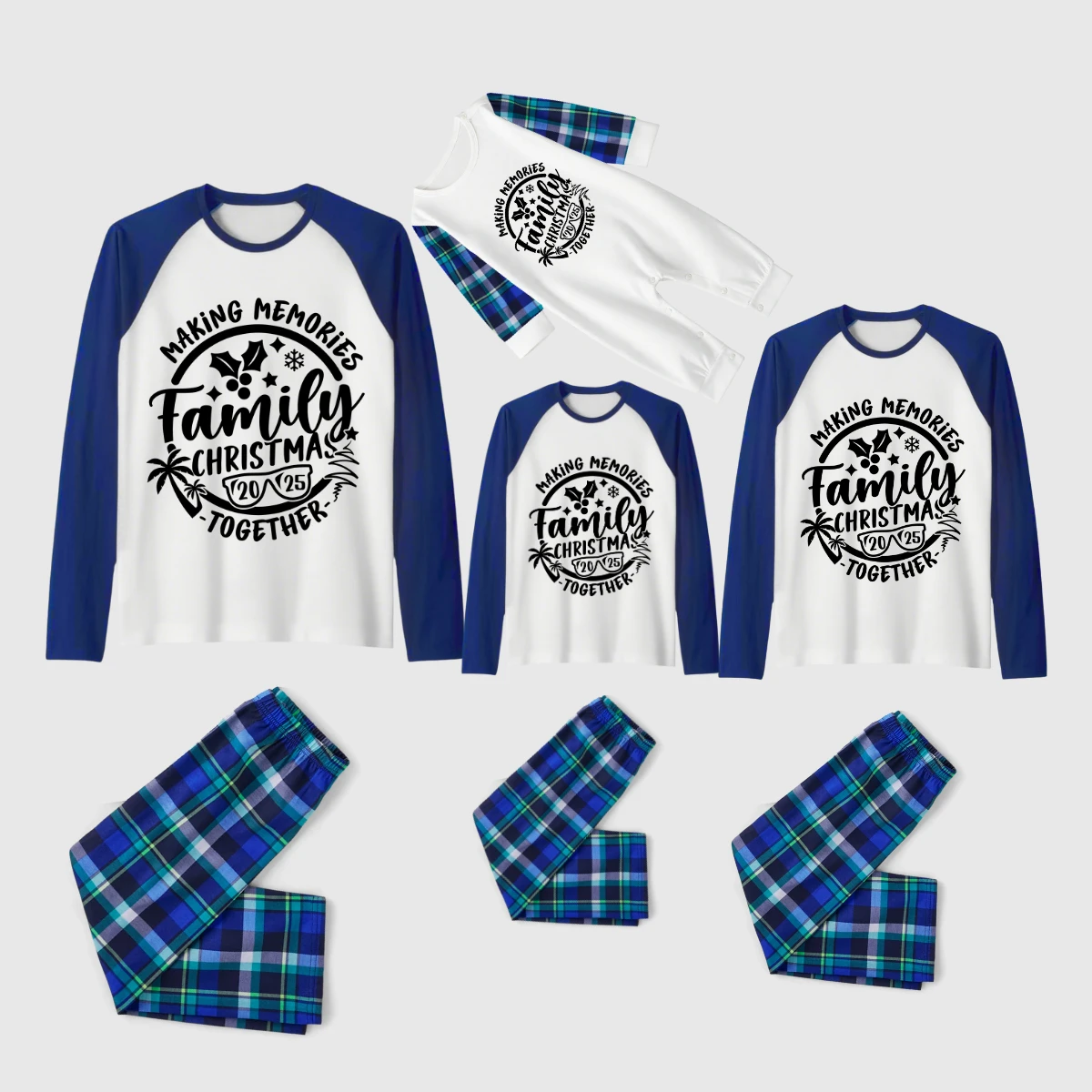 'Our Family Chirstmas 2025 Making Memories Together' Letter Print Blue Long Sleeve Top With Blue Plaid Family Matching Pajamas