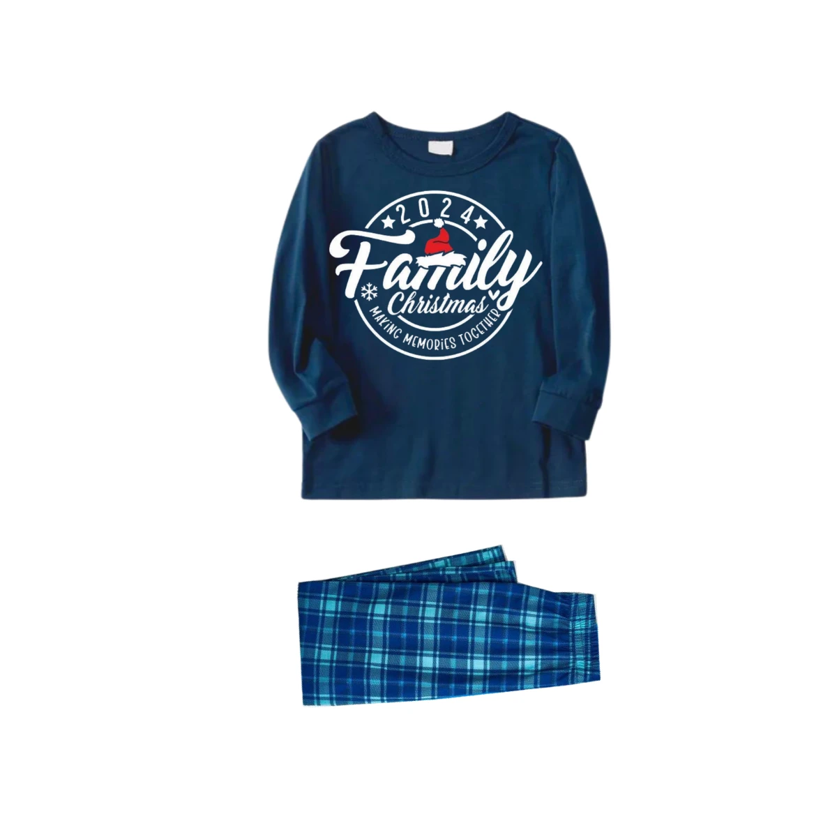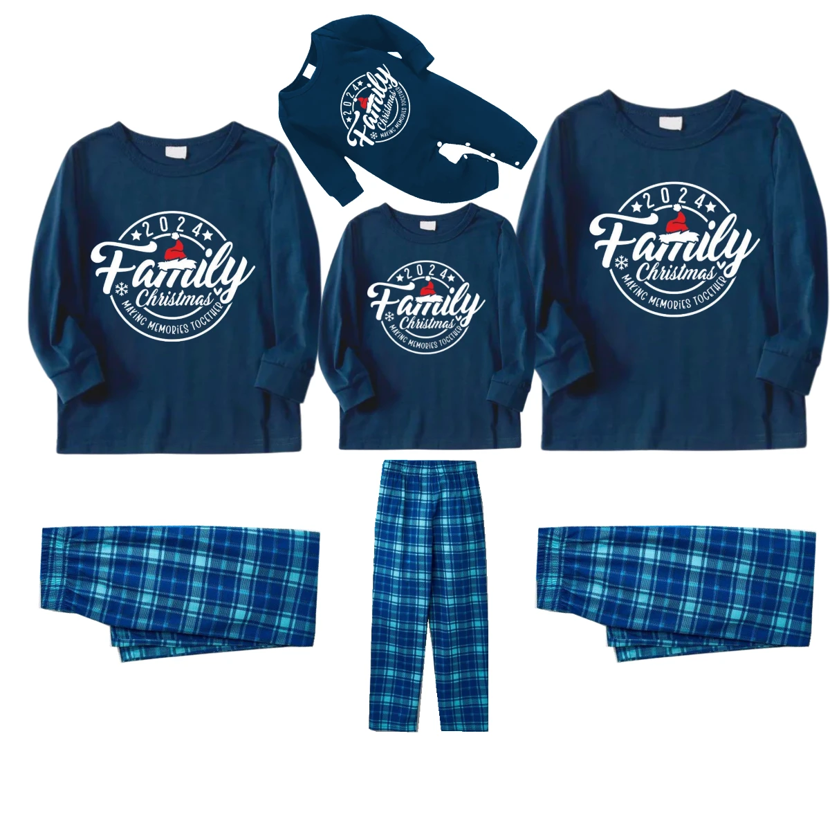 "2024 Family Christmas Making Memories Together" Text Ring Pattern - Blue Long Sleeve Top With Blue Plaid Family Matching Pajamas