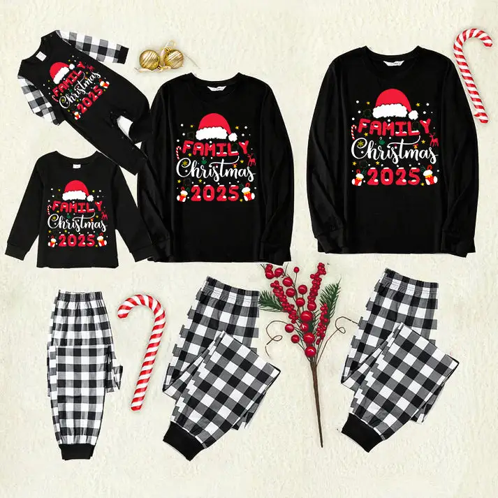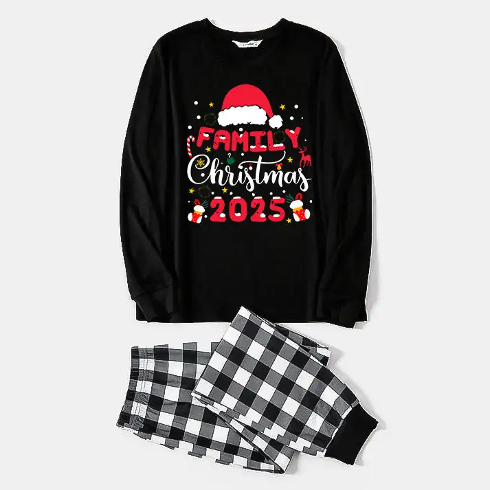 "2025 Family Christmas" Text and Christmas Pattern Black and White Plaid Family Matching Pajamas