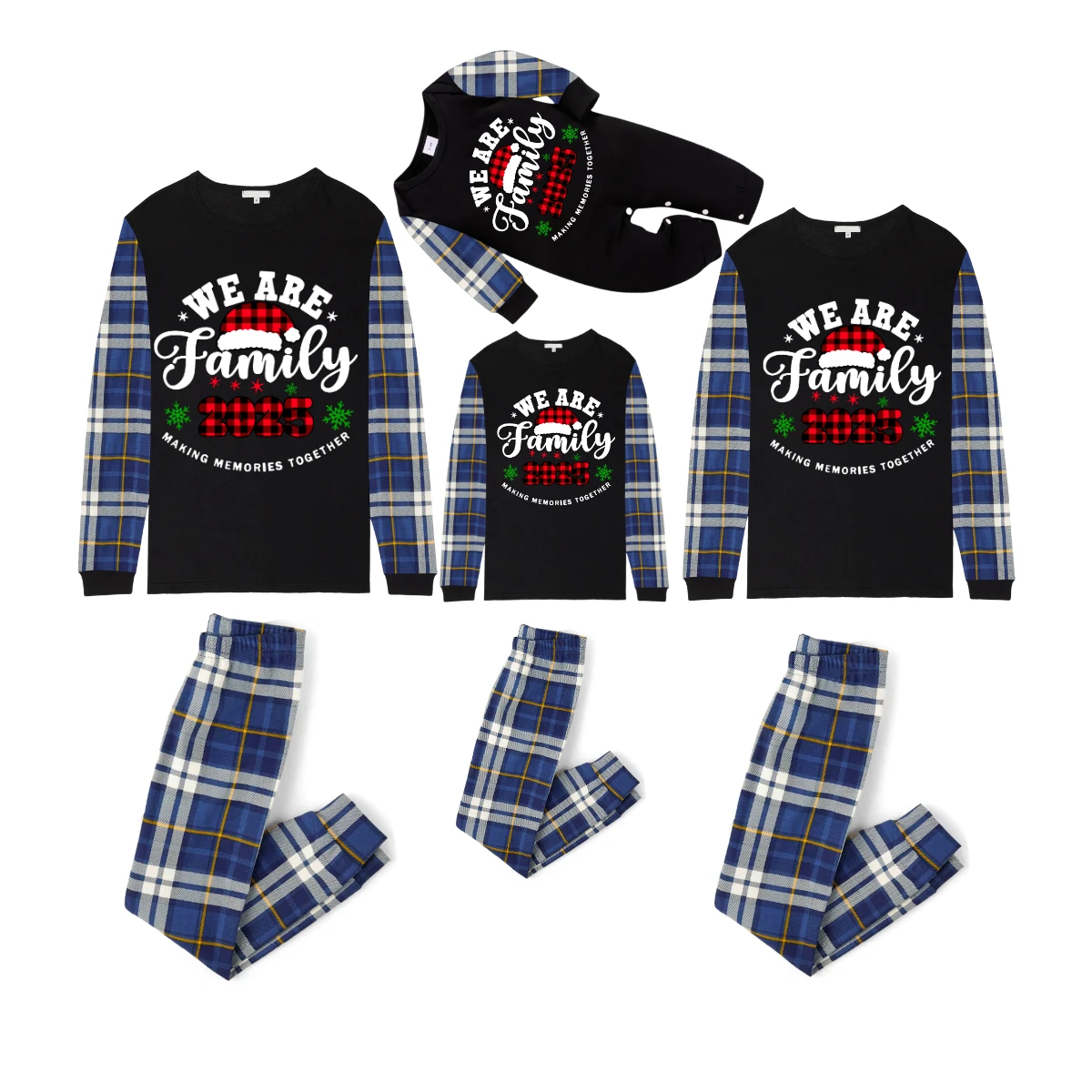 2025 We Are Family Christmas Family Pajamas Set - Black Top / Blue Plaid Pants / Blue Plaid Sleeves
