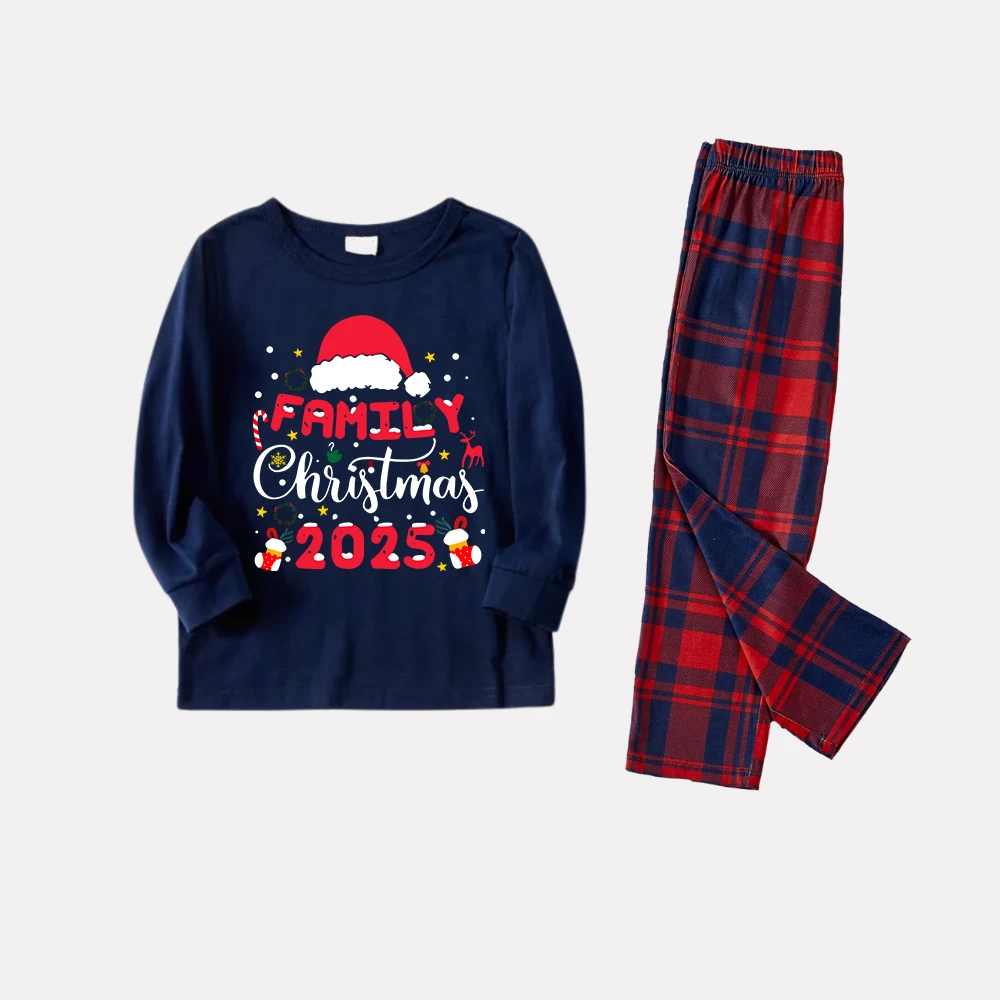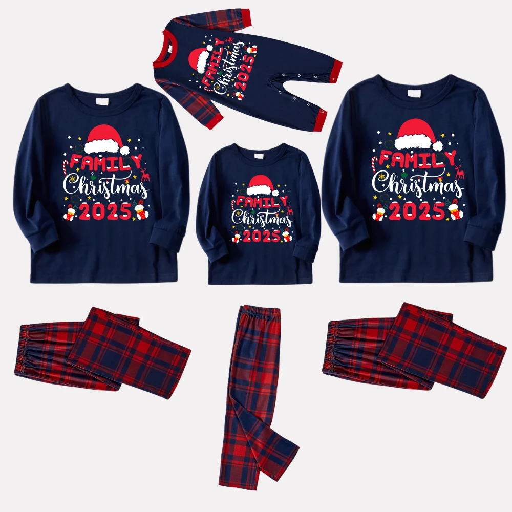 Cute "Family Christmas 2025" Pattern Printed Red and Blue Plaid Christmas Matching Pajamas