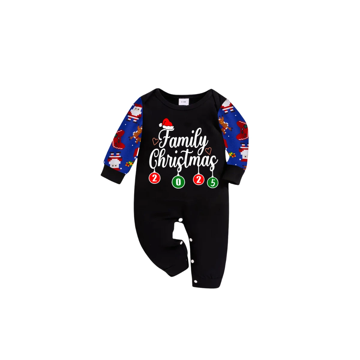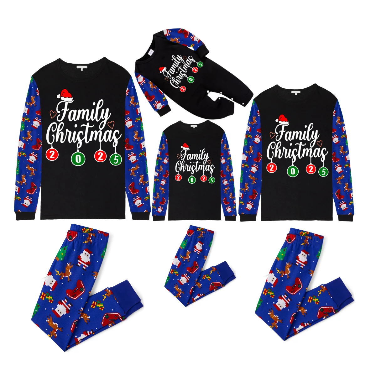 Family Christmas 2025 Pajamas Set - Black Top / Blue Santa & Reindeer Print Sleeves & Pants