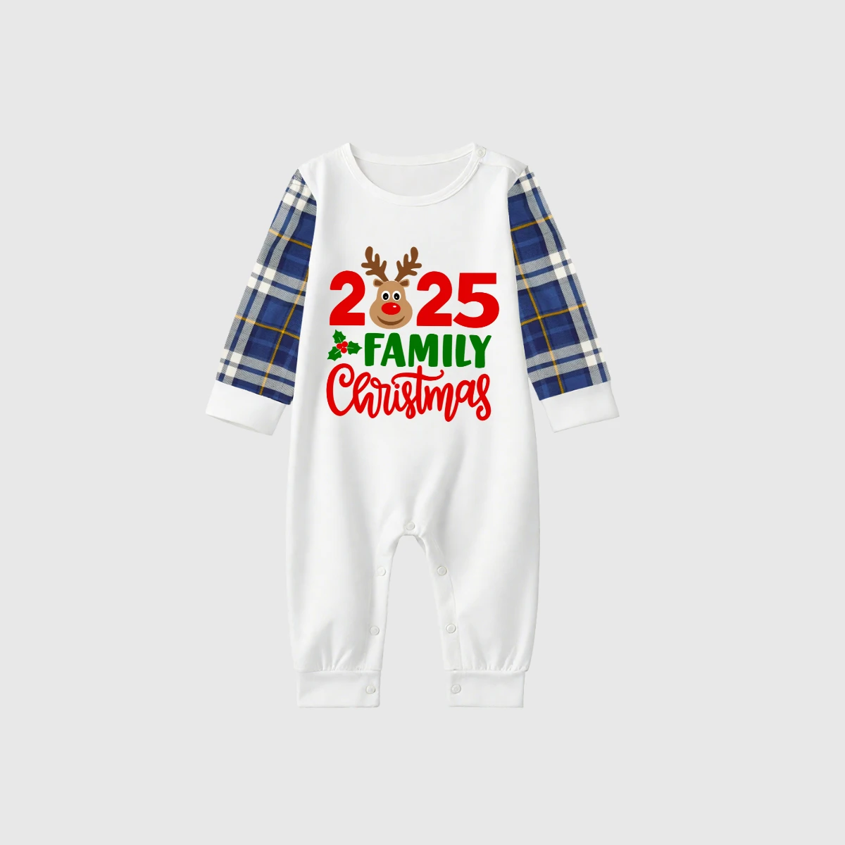 2025 Reindeer Family Christmas Family Pajamas Set - White Top / Blue Yellow Plaid Pants / Blue Sleeves