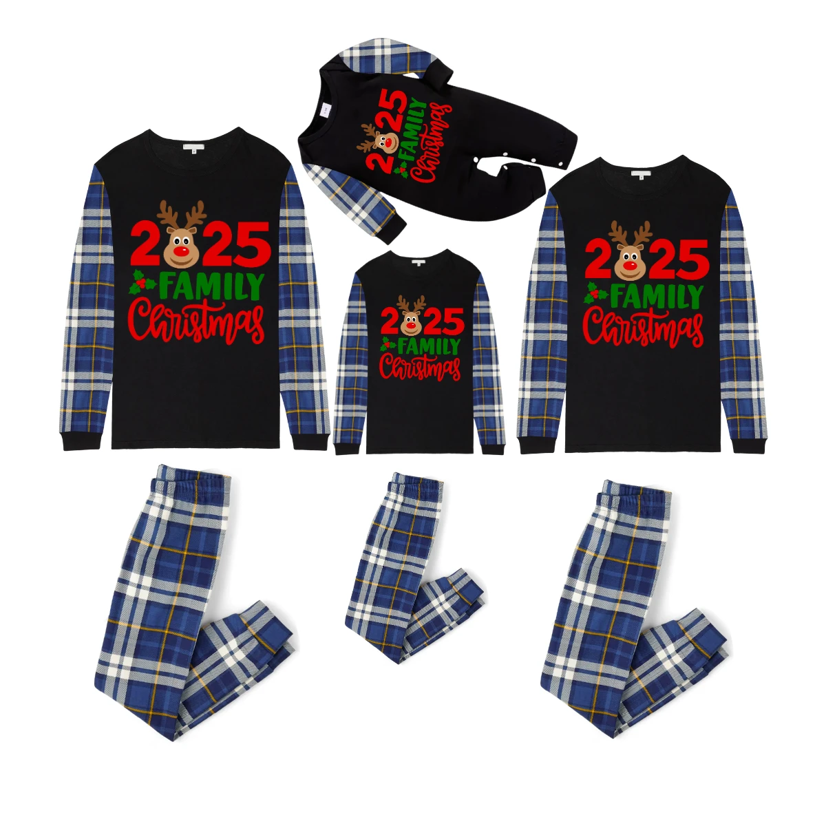 Cute Elk and "2025 Family Christmas" Text Print Black & Red Plaid Christmas Matching Pajamas