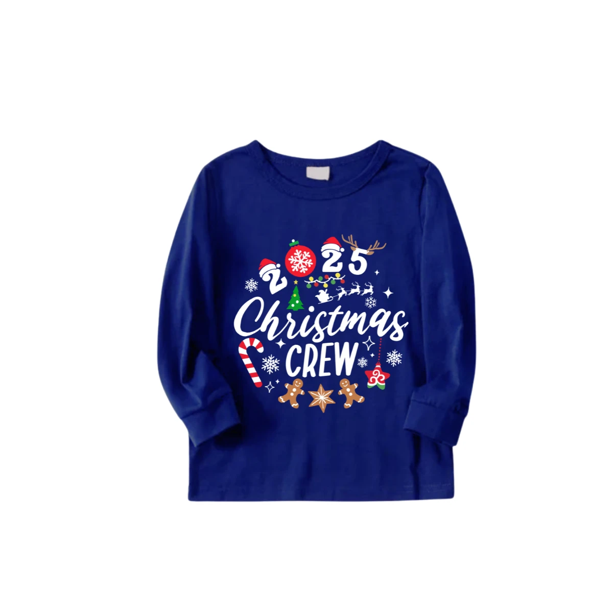 Christmas Crew 2025 Family Pajamas Set - Blue Top, Blue Pants, Blue Christmas Cartoon Sleeves, Gingerbread Candy Print