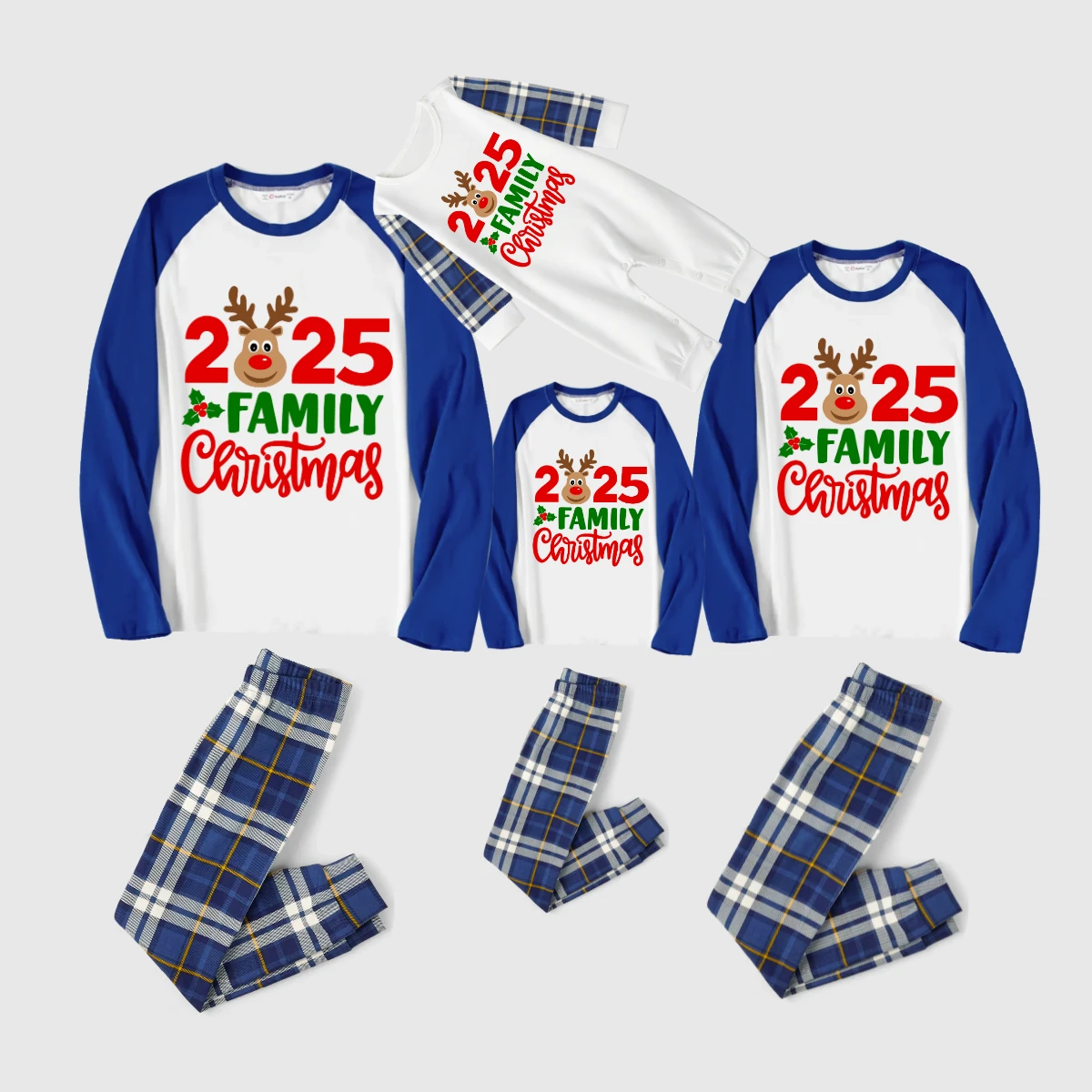 "Family Christmas 2025" Letter Printed Blue Long Sleeve Top With Blue Plaid Family Matching Pajamas