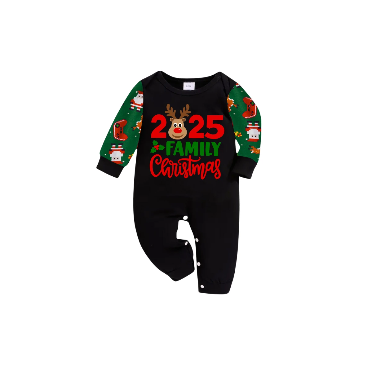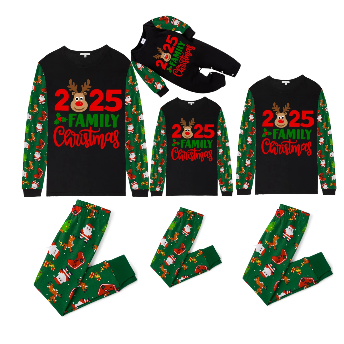 2025 Reindeer Family Christmas Family Pajamas Set - Black Top / Green Santa Print Pants / Green Santa Print Sleeves