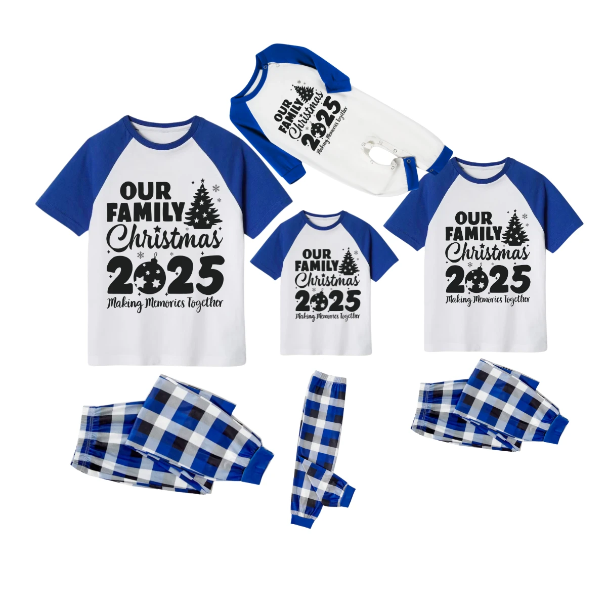 Our Family Christmas 2025 Family Pajamas Set - White Top, Blue Plaid Pants, Blue Sleeves, Christmas Tree and Ornaments Print