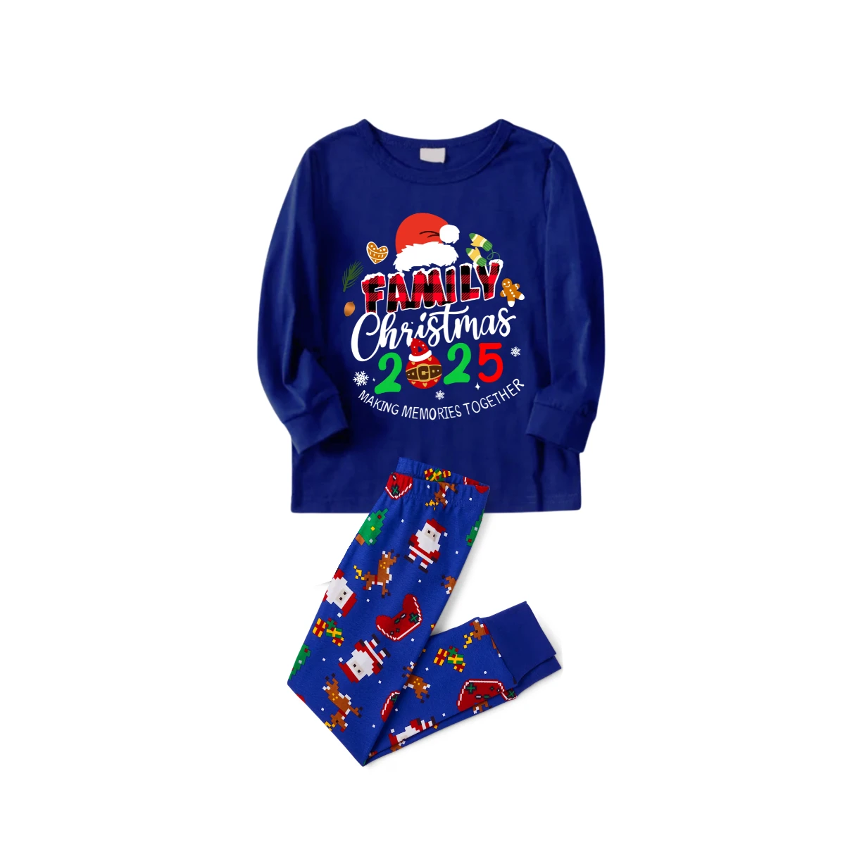 Merry Christmas 2025 Making Memories Family Pajamas Set - Blue Top, Blue Pants, Christmas Cartoon Sleeves, Santa & Gingerbread Print