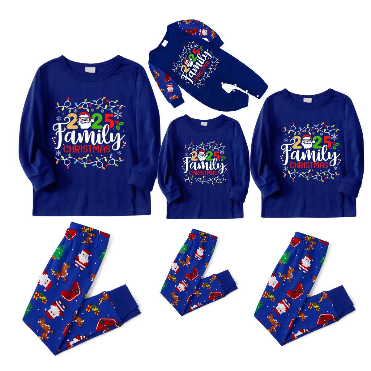 Cozy Blue Christmas Pajamas Set With Christmas Light and "2025 Family Christmas" Text Print