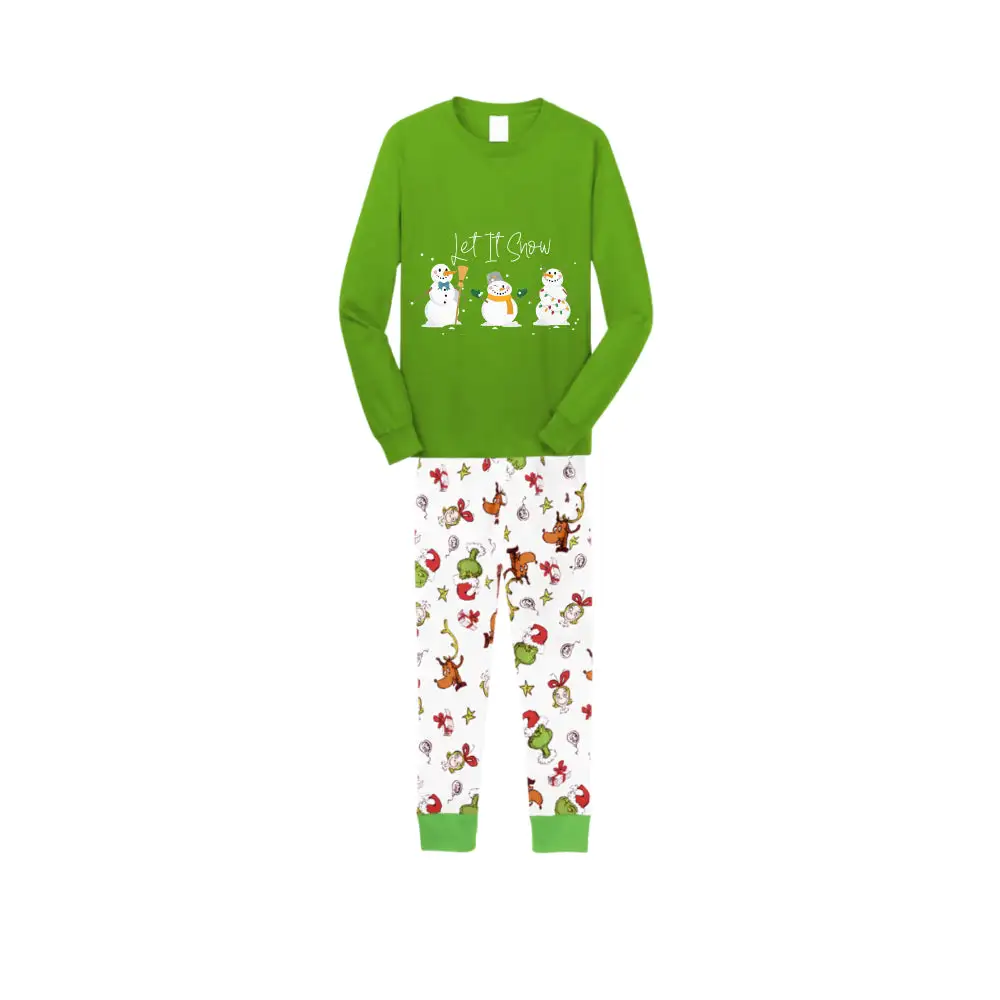 Christmas Family Matching Pajamas-Green Top and Grinch Pants Pjs Set with Snowman and "Let It Snow" Print