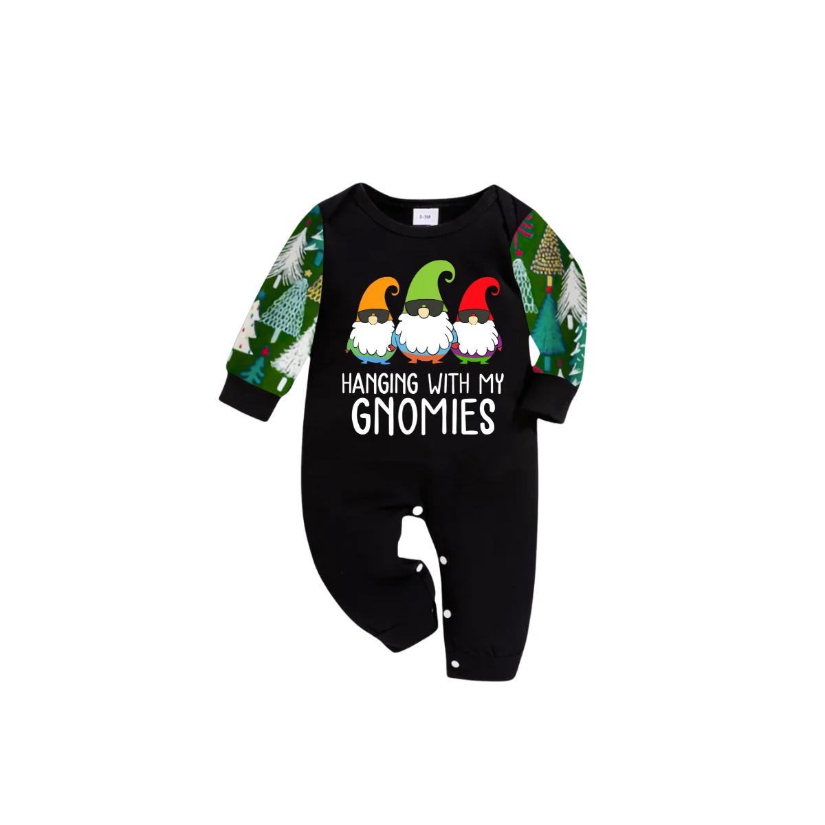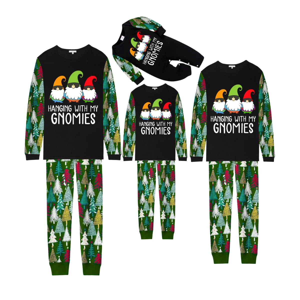 Hanging With My Gnomies Christmas 2025 Family Pajamas Set - Black Top, Green Pants, Christmas Tree Print Sleeves