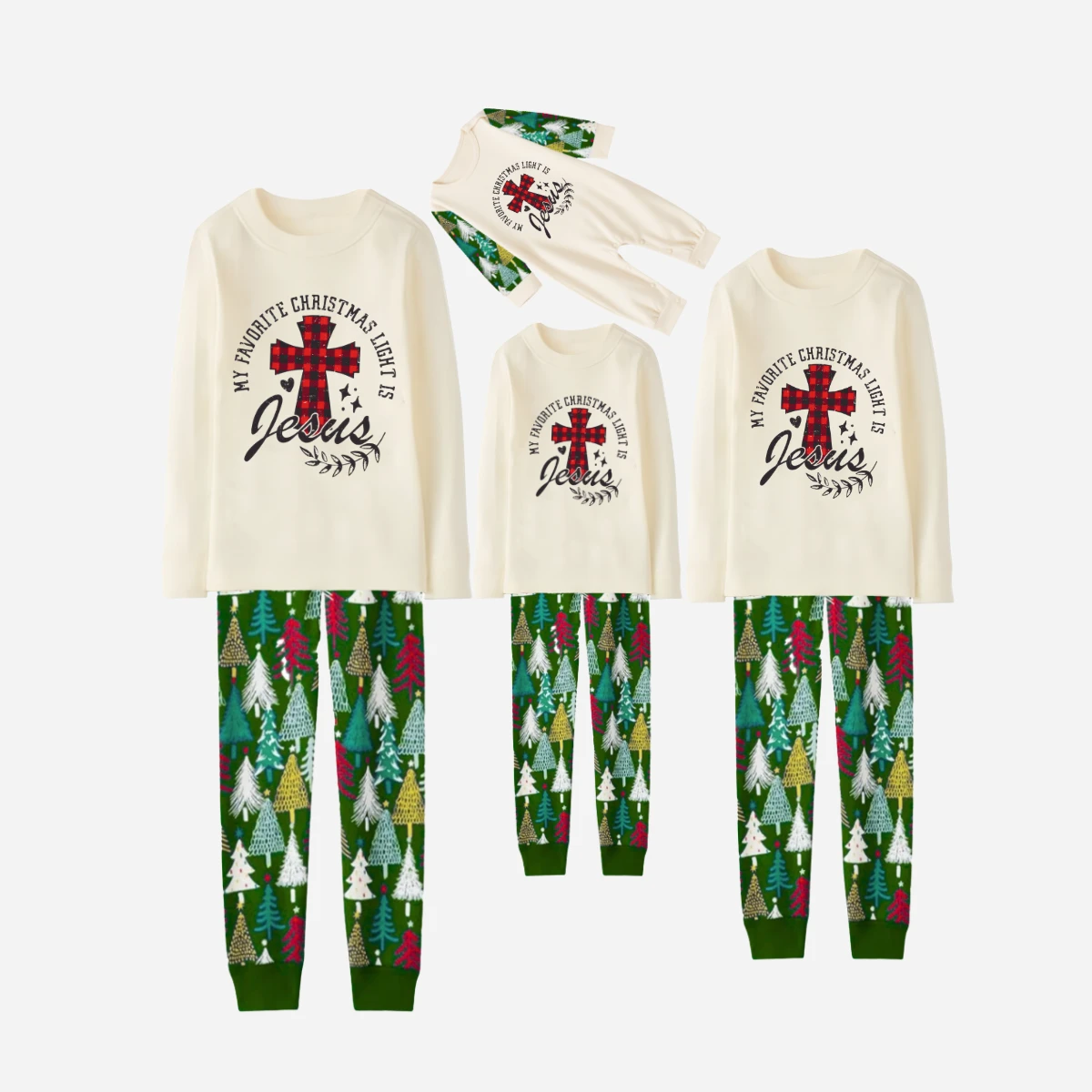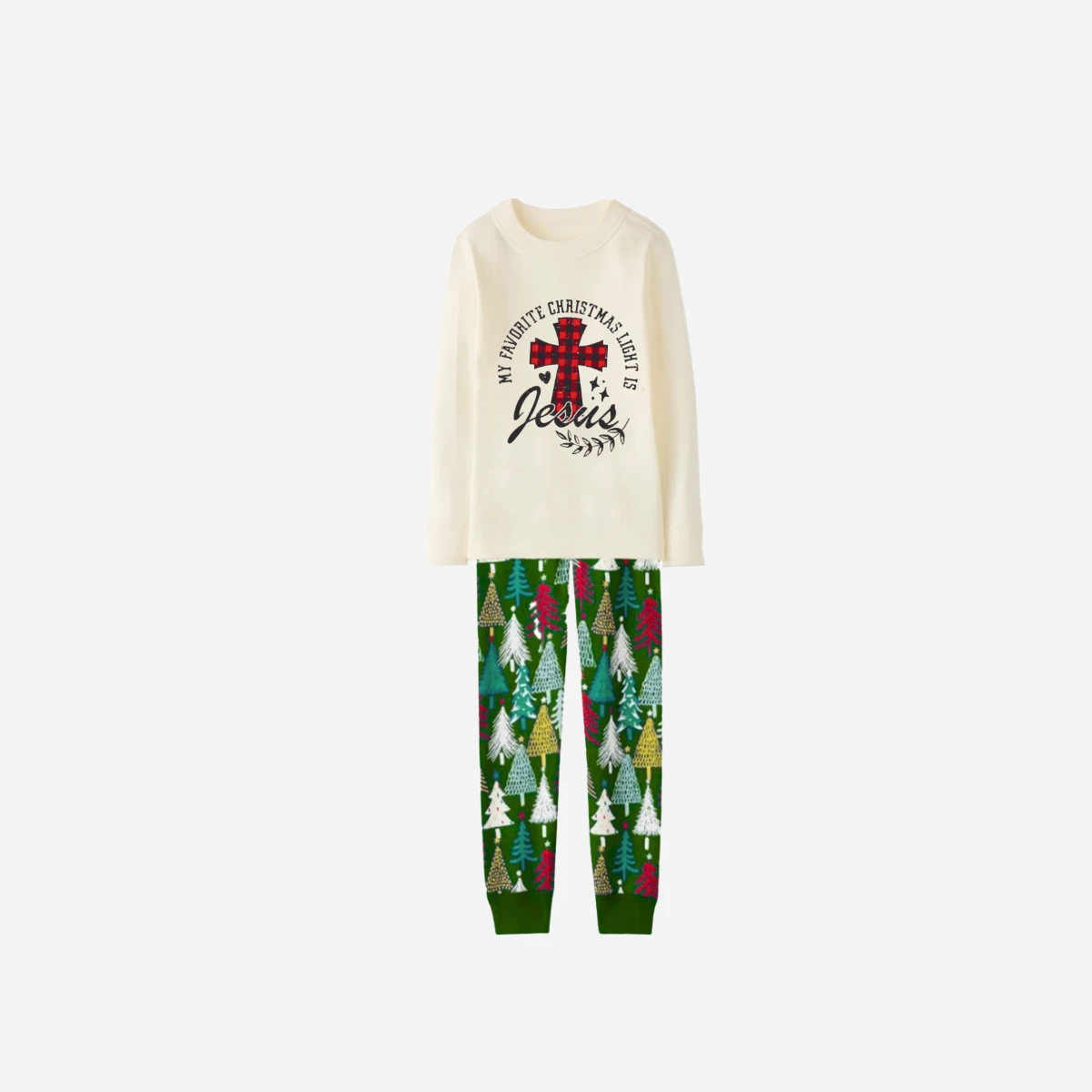My Favorite Christmas Light Is Jesus Family Christmas Pajamas Set - White Top with Christmas Tree Printed Pants