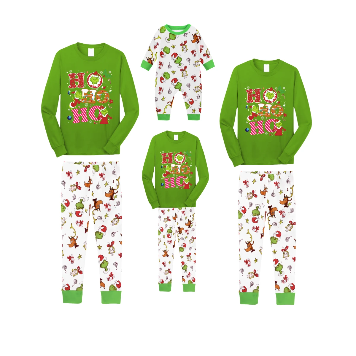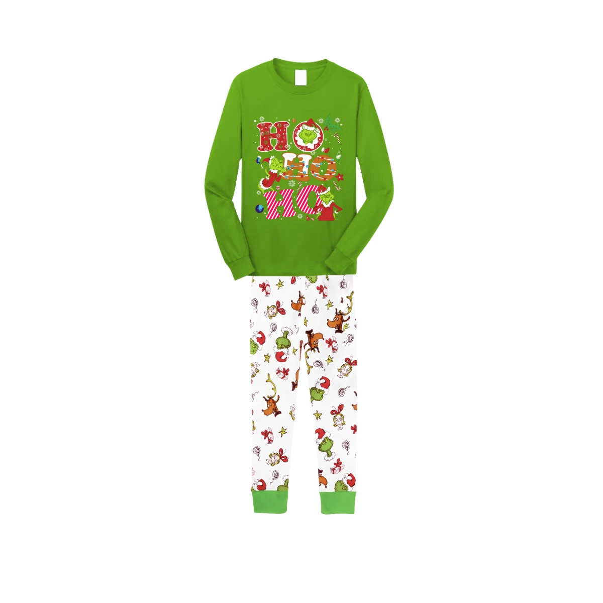 Green Top and Grinch Pants Pajamas Set With Grinch and "HO HO HO" Text Print