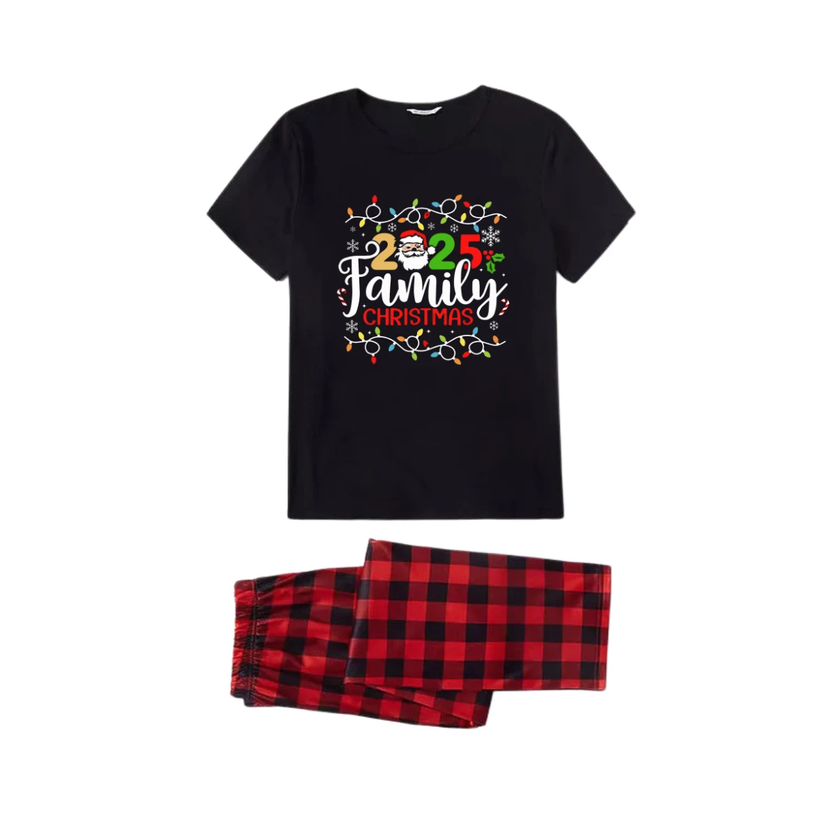 Red and Black Plaid Short Sleeve Christmas Pajamas Set With Christmas Light and "2025 Family Christmas" Text Print