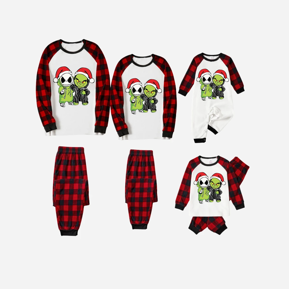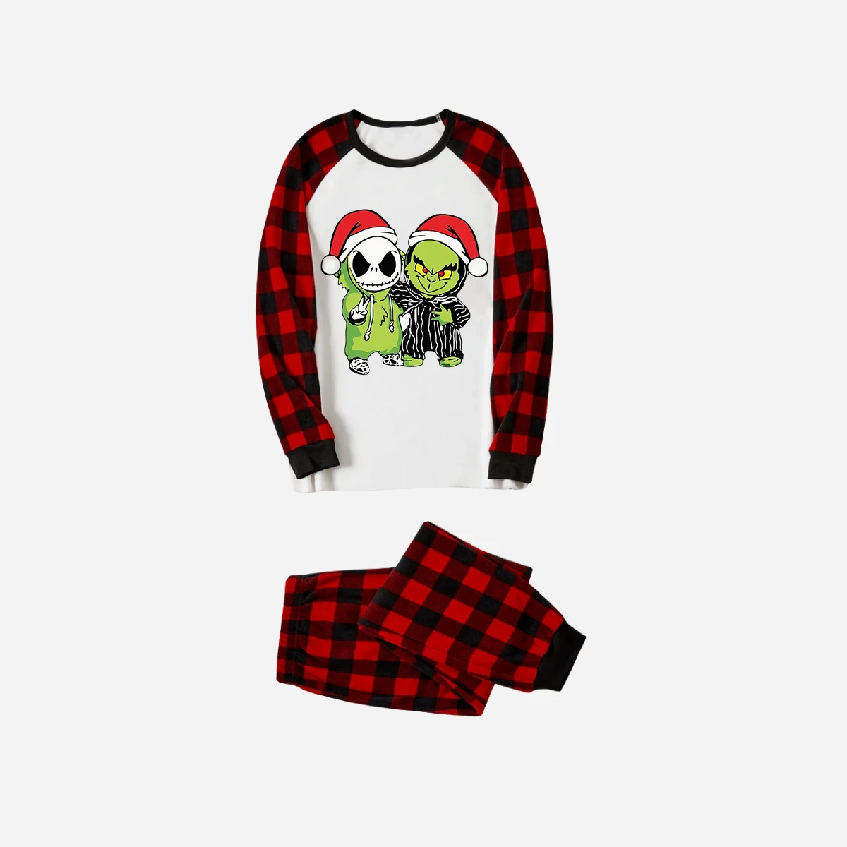 Red and Black Plaid Christmas Pajamas Set With Grinch and Cartoon Pattern Print
