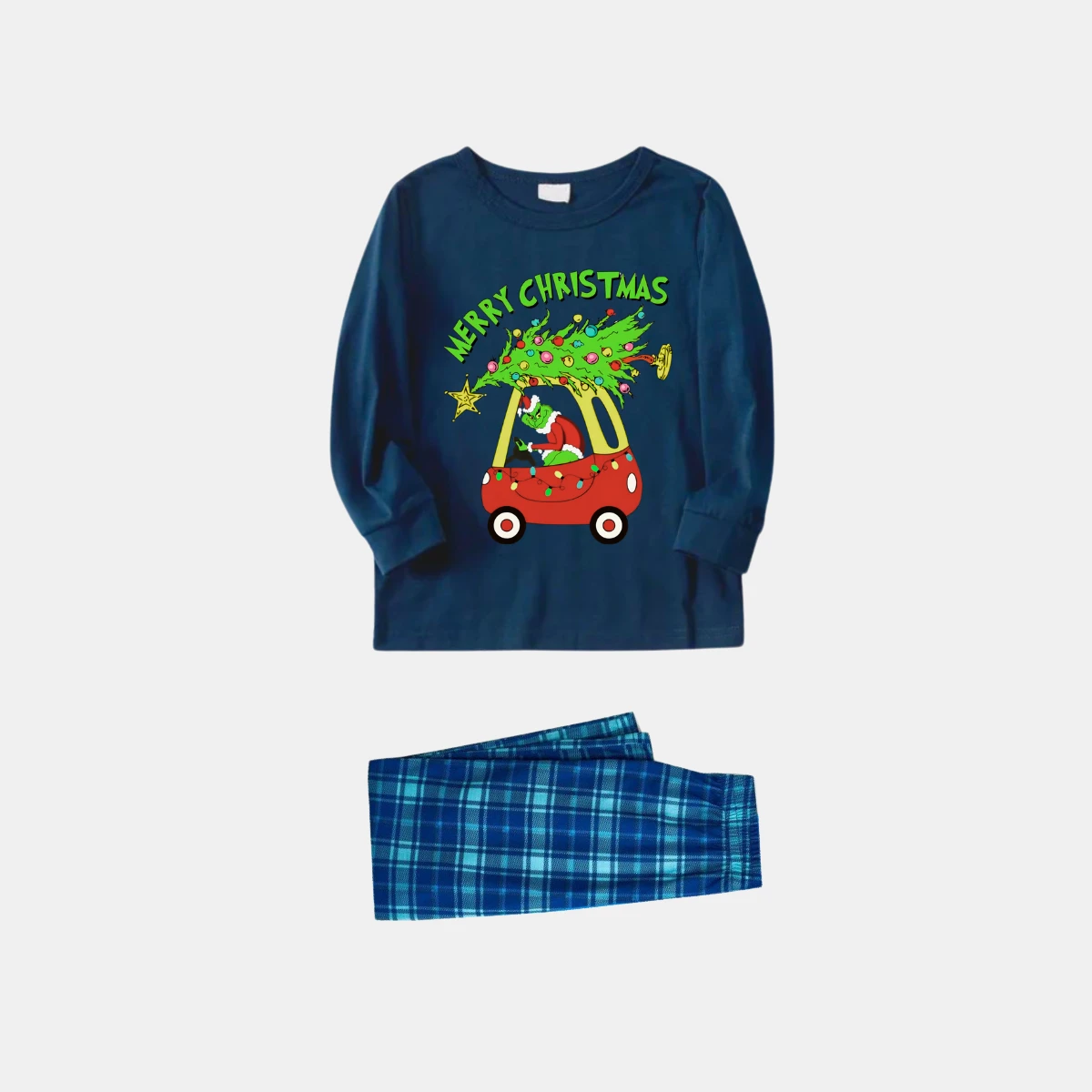 Navy & Sky Blue Plaid Christmas Pajamas Set With Grinch and Christmas Tree Print