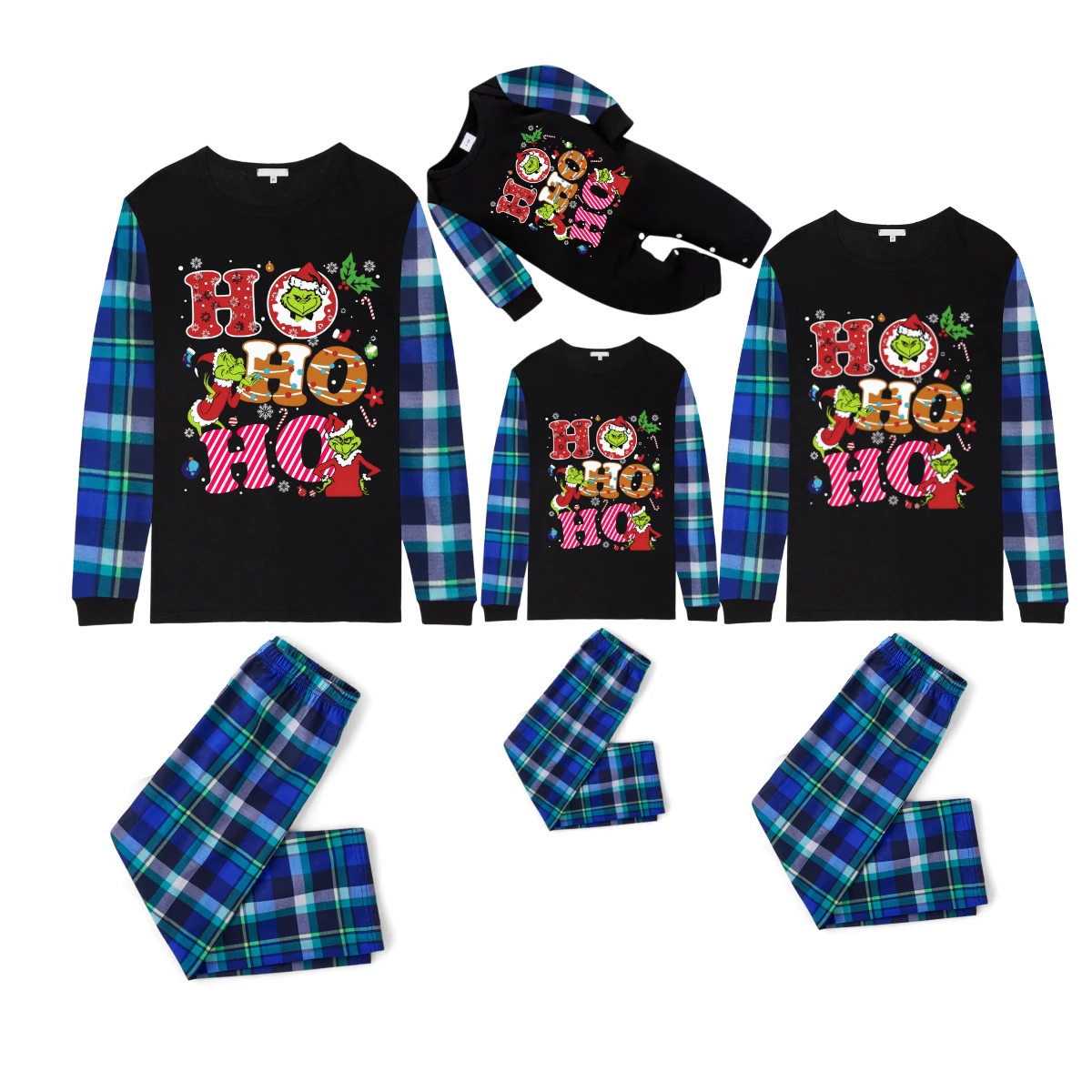 Blue and Green Plaid Christmas Pajamas Set With Grinch and "HO HO HO" Text Print