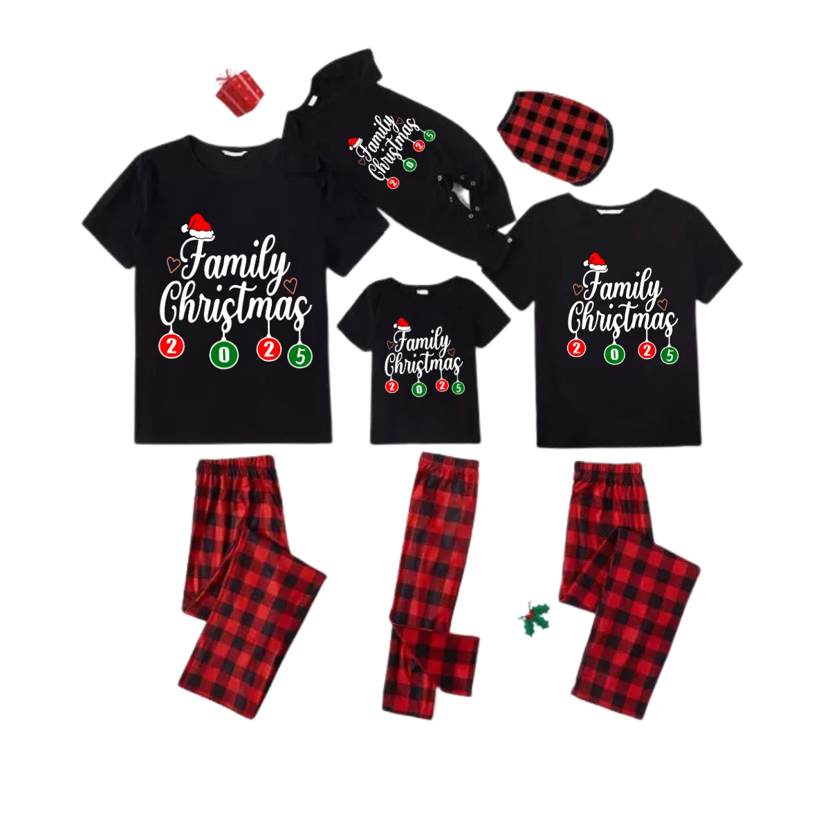 "Family Christmas" 2025 Letter Print Black Short Sleeve with Red & Black Plaid Pant Family Matching Pajamas